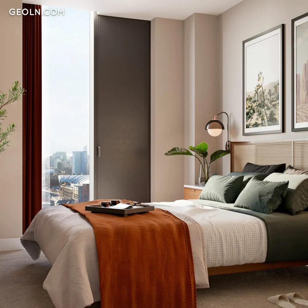 Вшановуючи виразний характер місцевості, три вежі на Вікторії Ріверсайд - з видом на місто, з видом на парк та з огляду на корону - демонструють красиво оформлені фасади, які відрізняються щедрим склінням, підкресленим яскравими кольорами. Схема варіюється від 6 до 36 поверхів висотою, а коротші ділянки вибирають більш традиційний вигляд за допомогою гладкої цегляної кладки. Нова будівля може похвалитися величезною кількістю величезних вікон від підлоги до стелі, які дозволяють мешканцям насолоджуватися захоплюючим видом на парк Сіті-Рівер, центр міста або парк Ангел-Луг.