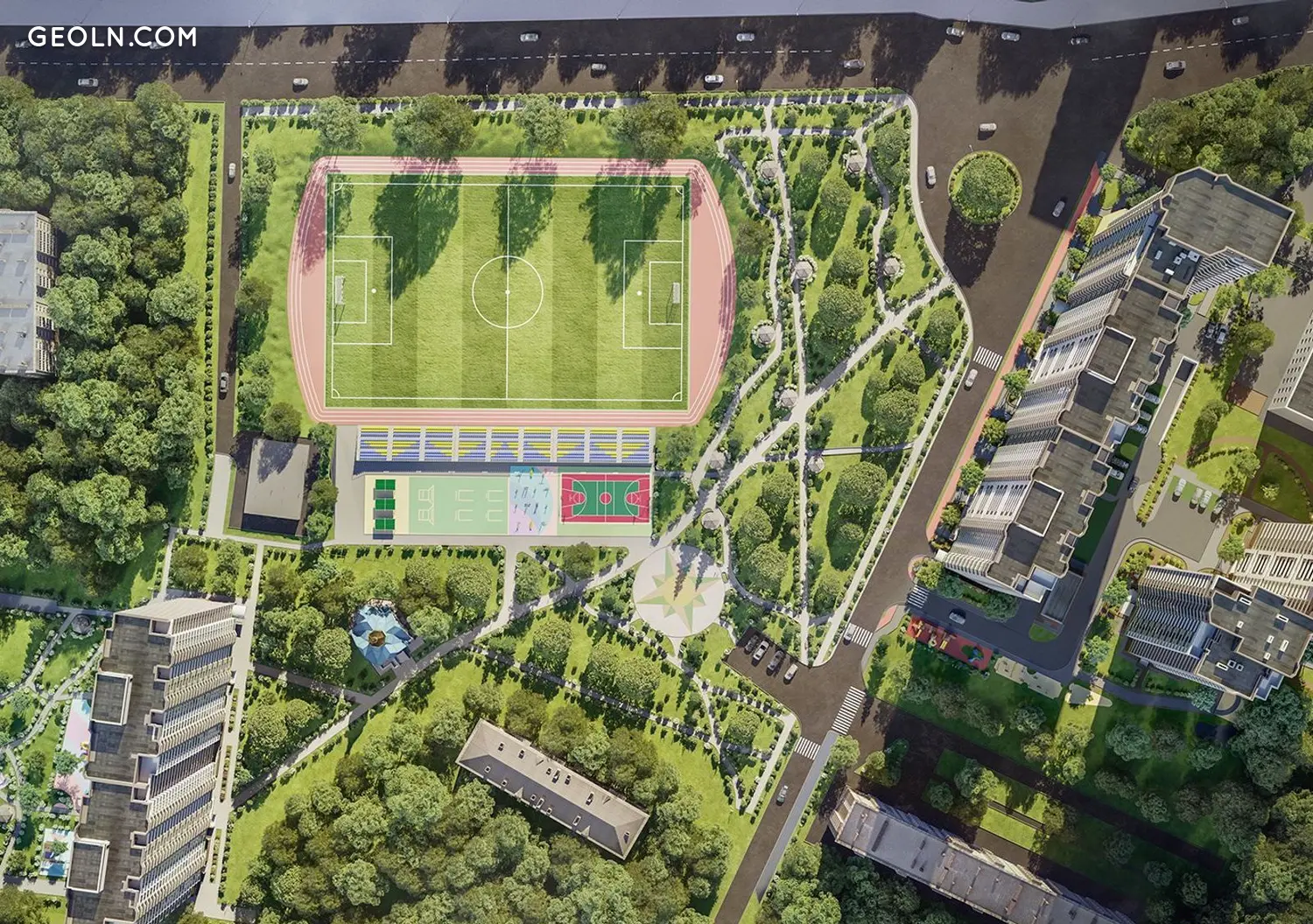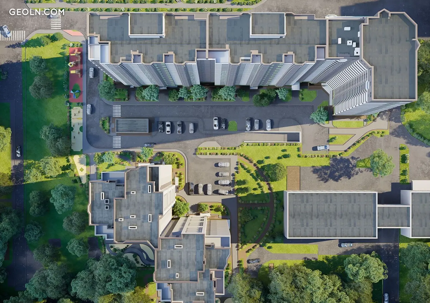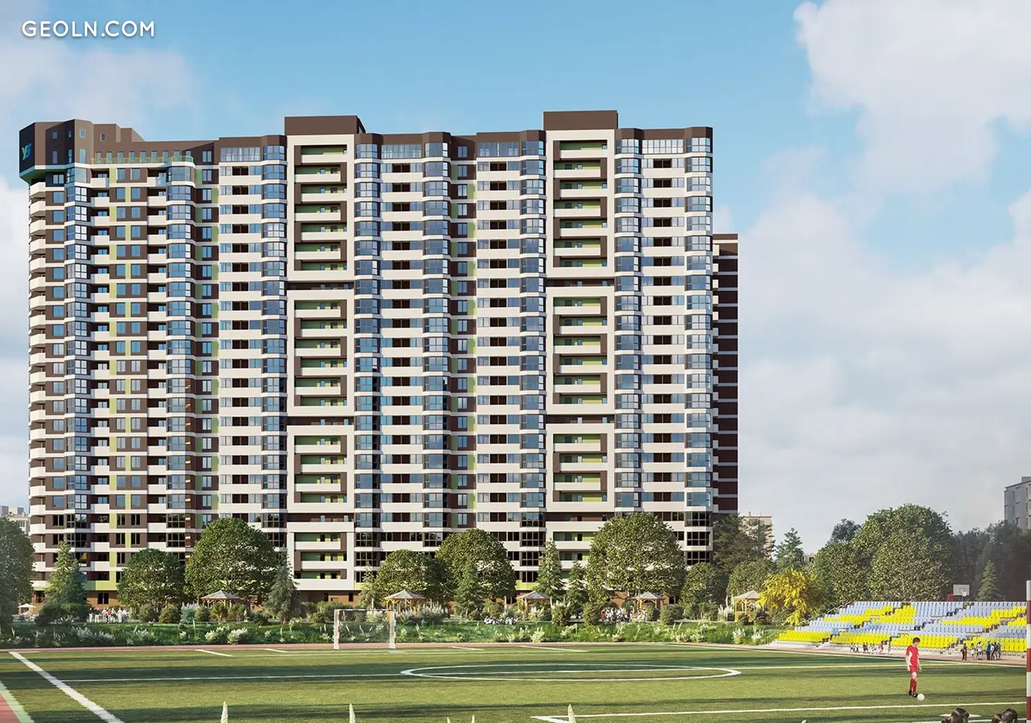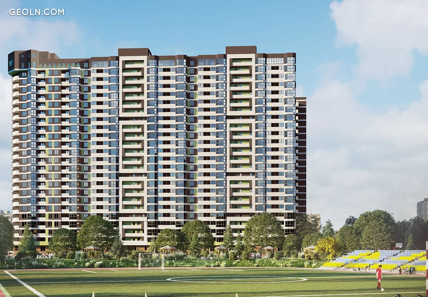 The complex consists of 3 houses, united by a common adjacent territory, Rembazovsky Park and a sports stadium. The project of the adjacent territory of the complex includes the transformation of the park area, arrangement of a sports ground and children's play areas.