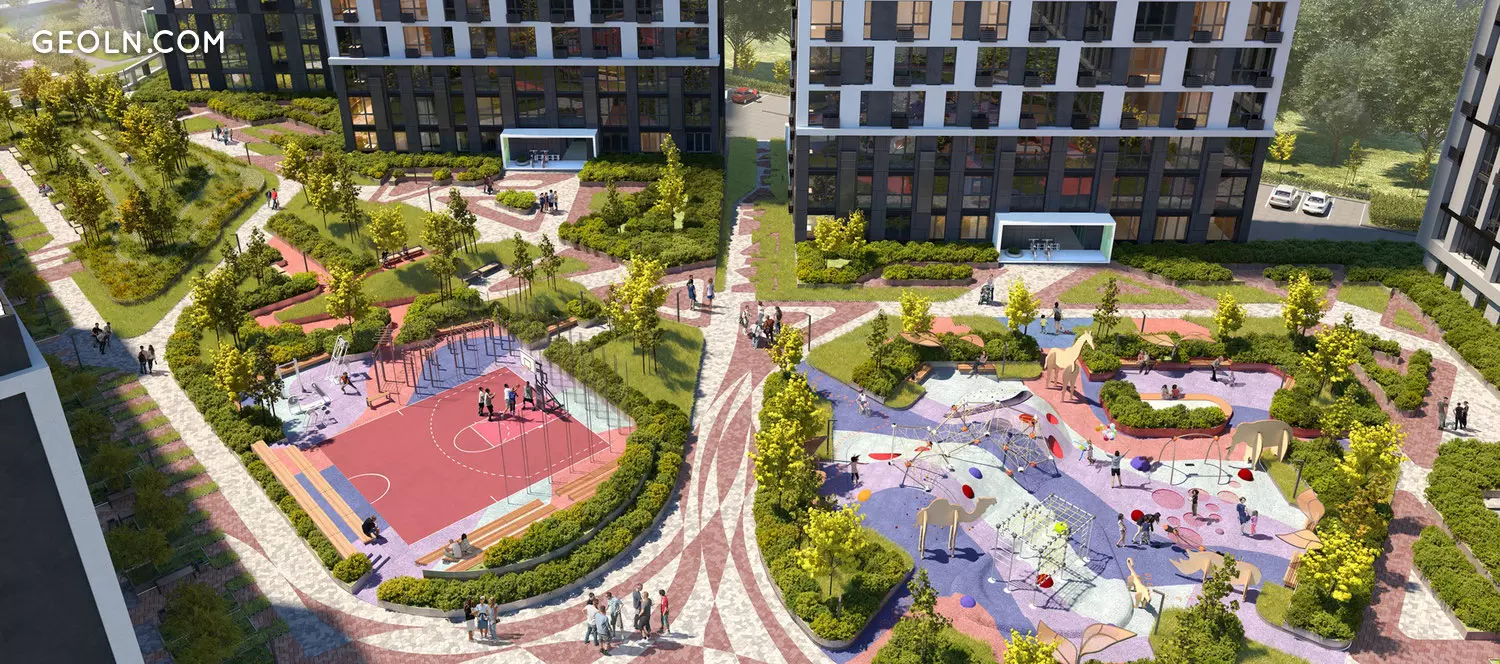 The concept “yard without a car” is implemented in the courtyard - the interior of the Slavutich 2.0 complex is not accessible for cars and is divided into children's, sports and walking zones, which are interconnected by pedestrian alleys.