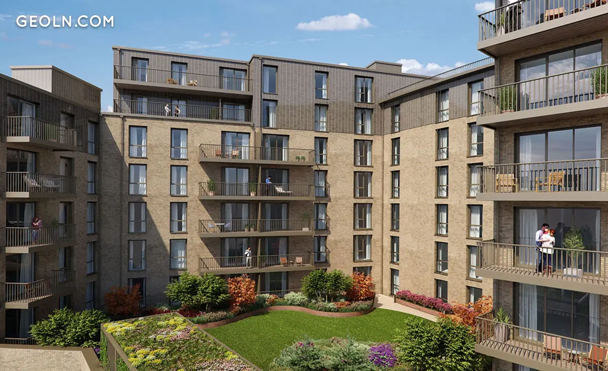 Padcroft comprises a beautiful collection of mid-rise buildings, surrounded by landscaped gardens and footpaths. The first three buildings form a line, stretching from Tavistock Road to Bentinck Road. The rest of the complex structures resemble four sun rays, coming from the spacious central courtyard. The façades feature soft beige brickwork and sleek floor-to-ceiling windows. Some buildings opt for a more traditional village-like feeling with straight-line railings, covering an impressive collection of stacked balconies, while others come with more modern-looking glass balustrades.