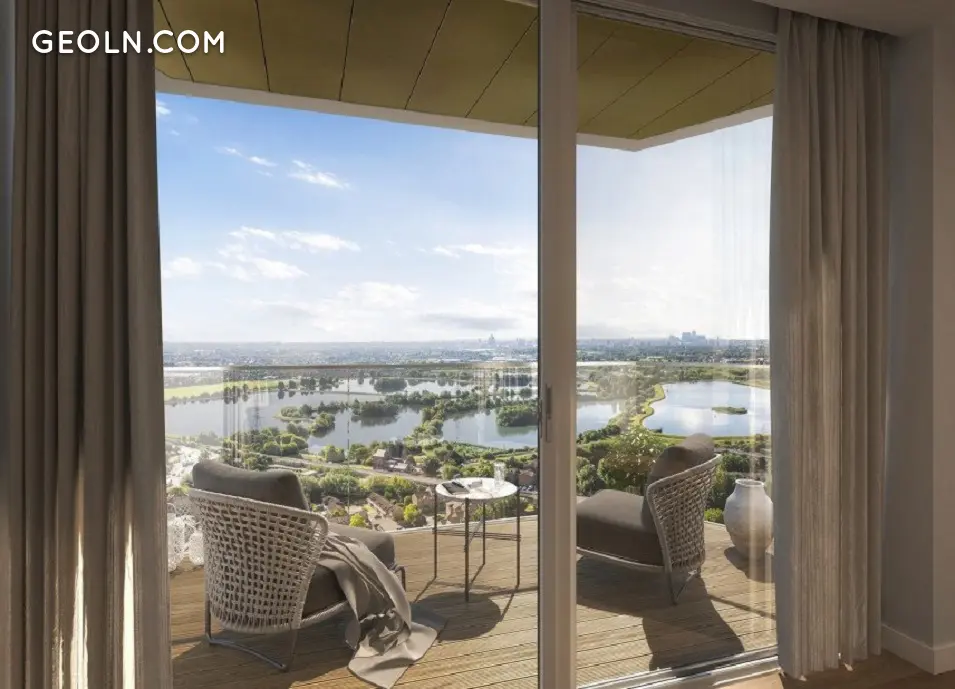 The final part of the greater regeneration scheme Hale Village, the new mixed-use tower rises up to 32 storeys, making a stunning addition to Tottenham Hale’s skyline. Featuring sleek panelling, the strikingly white façade is accentuated by the contrasting black ground floor. The exterior is lined with rows of floor-to-ceiling windows, highlighting the silhouette of the building. Overlooking Walthamstow Wetlands, the looming development amazes with its sophisticated contemporary-style façade that complements the rest of Hale Village.