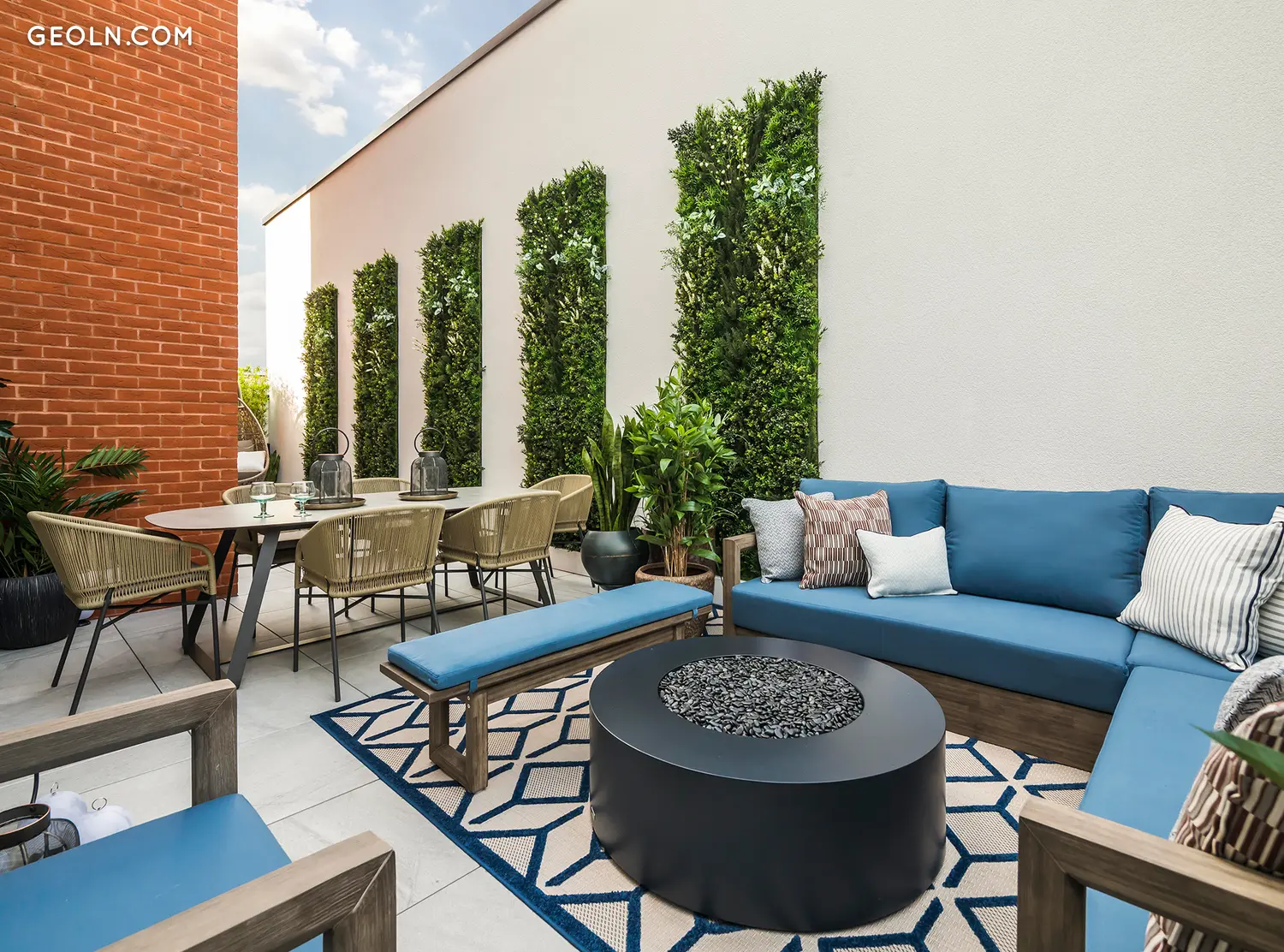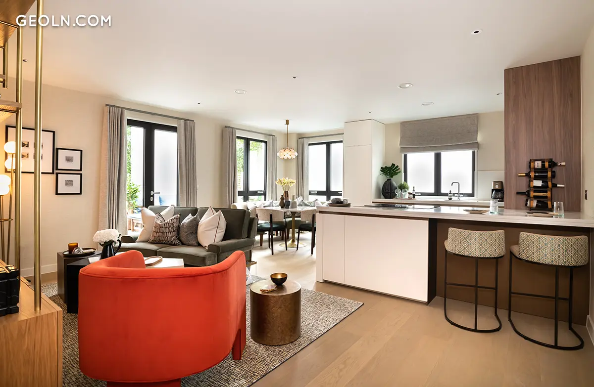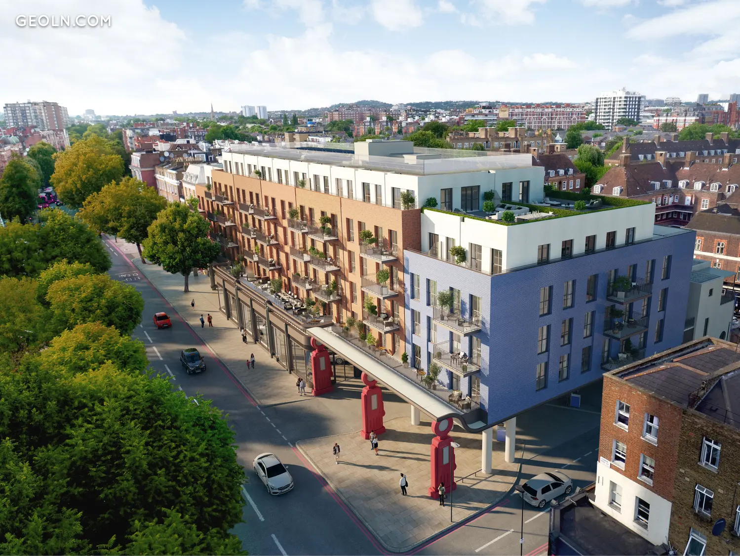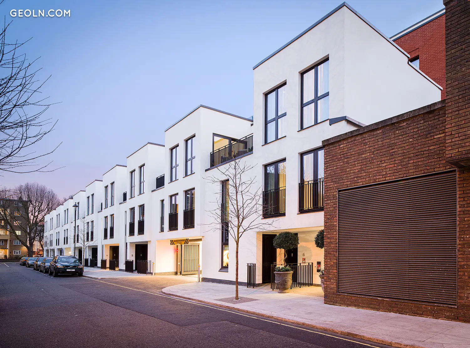 Lyons Place is a stylish and vibrant residential complex in a contemporary style with exterior walls in various colours, including blue, orange, and white. The complex is a collection of several beautifully designed buildings while the number of floors varies from 2 to 5. The famous British architect Sir Terry Farrell worked on the design. Attention is drawn to the abundance of floor-to-ceiling windows and balconies. The roofs of the buildings are flat.