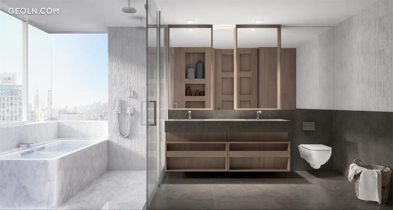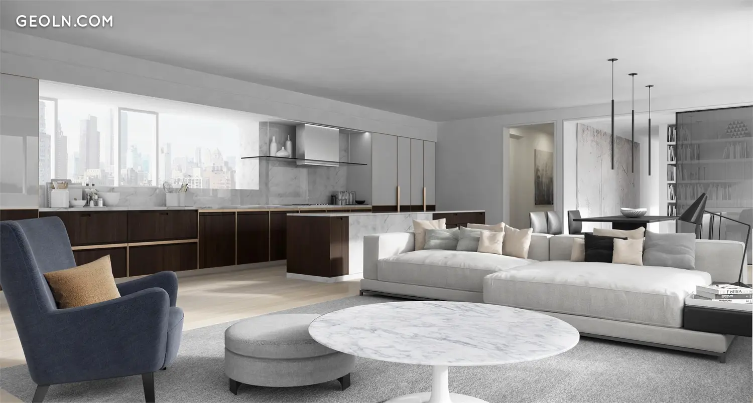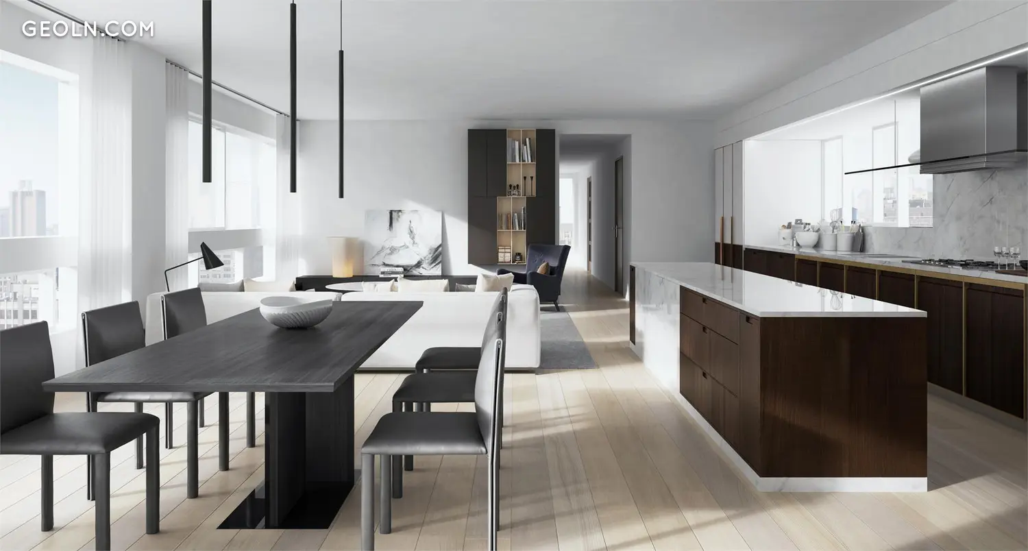 Each 4-bedroom, 3.5-bathroom unit boasts airy 9-ft ceilings, gorgeous oak flooring with radiant heating, key-locked elevator access, pre-wiring for smart home customization, central heating and cooling and multi-zone control, an in-unit washer/dryer from Whirlpool, pre-wiring for motorized shades, seamless multi-paned windows with northern, eastern, and western exposure, and an elegant kitchen equipped with a massive island, custom cabinets and millwork from NY Loft, marble countertops and backsplashes, and a suite of fully-integrated appliances from Miele.