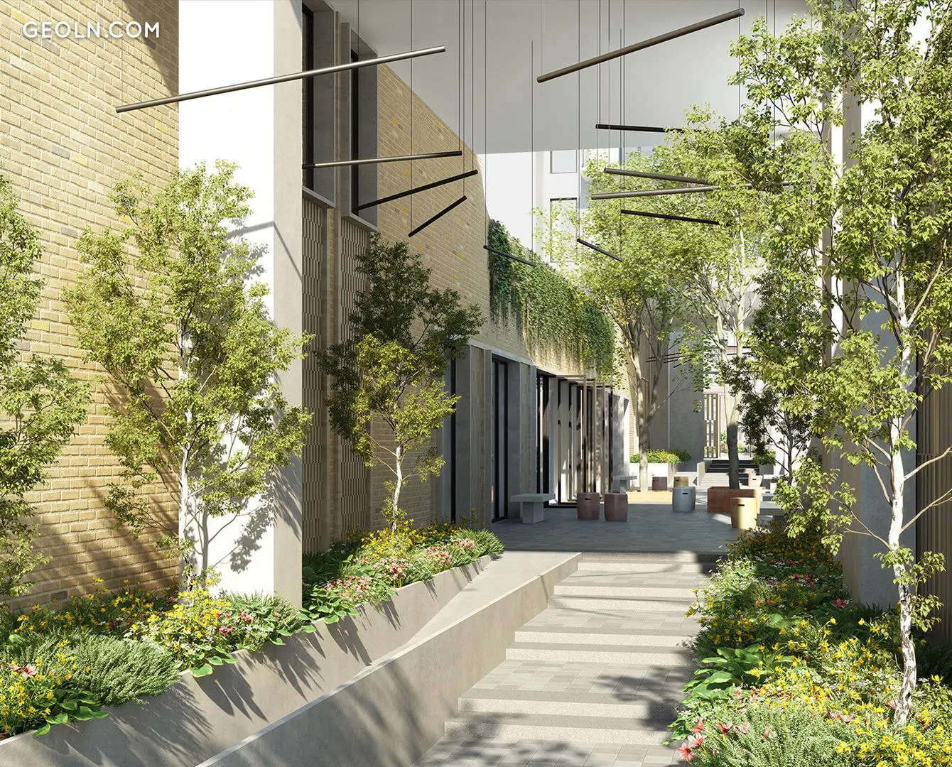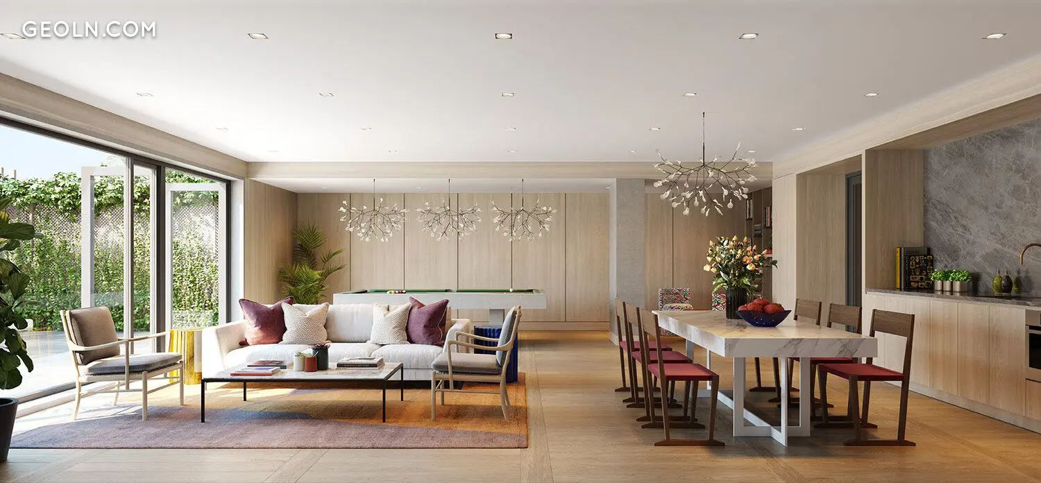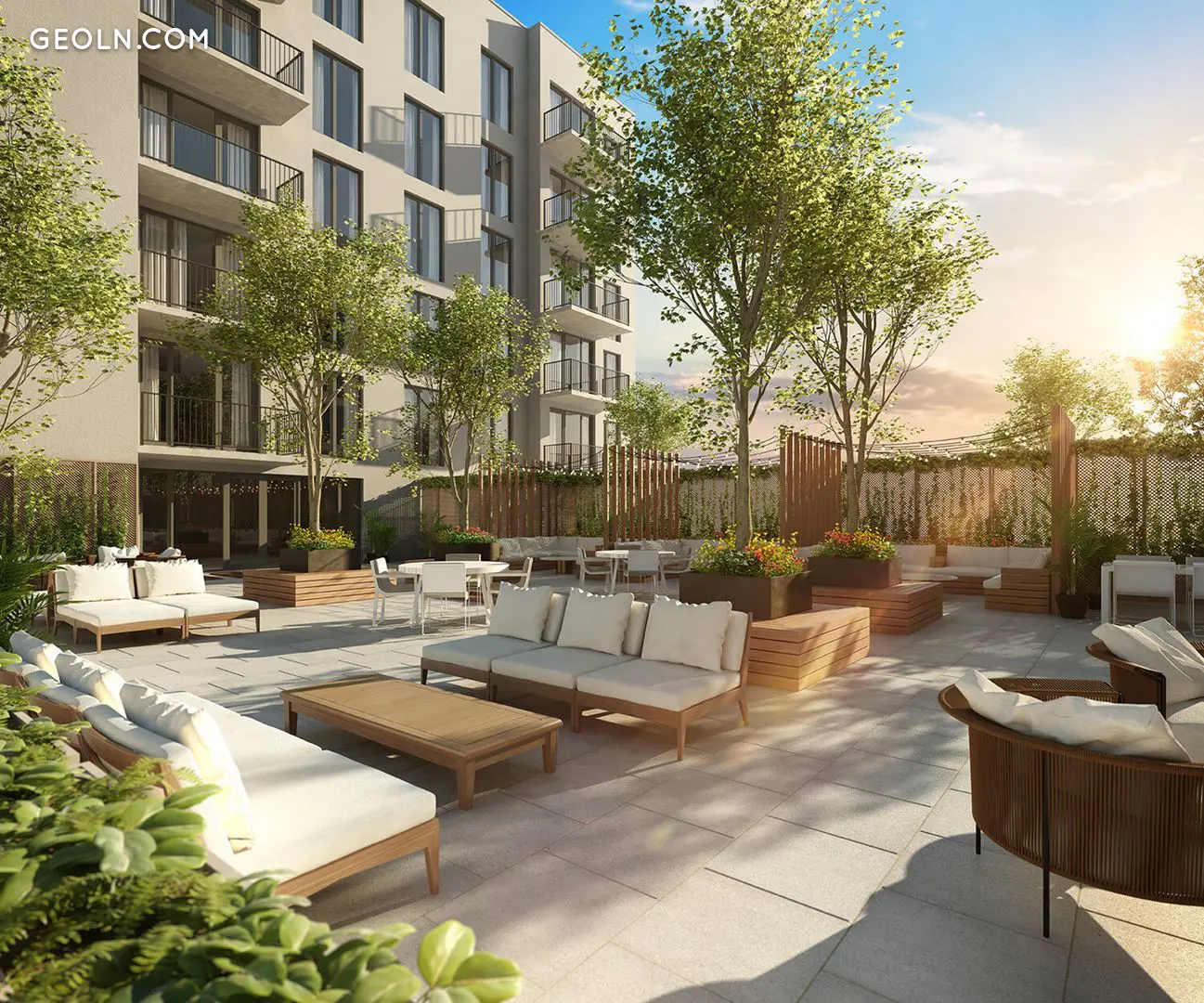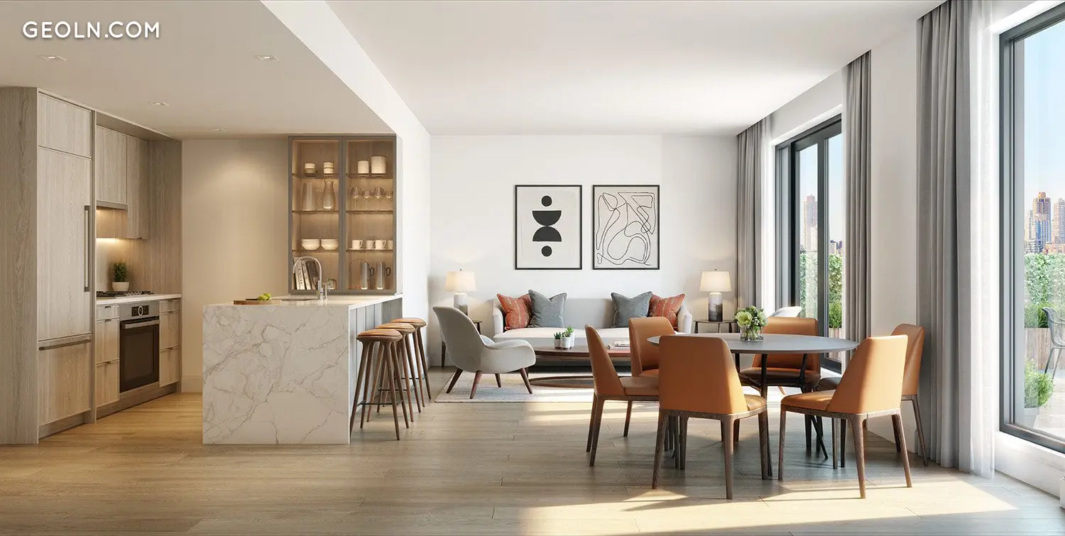 Open-concept living areas at The Neighborly use space efficiently and are designed to maximize natural light. Wide plank white oak floors and triple pane floor-to-ceiling windows come standard, and private balconies and terraces are luxurious additions.