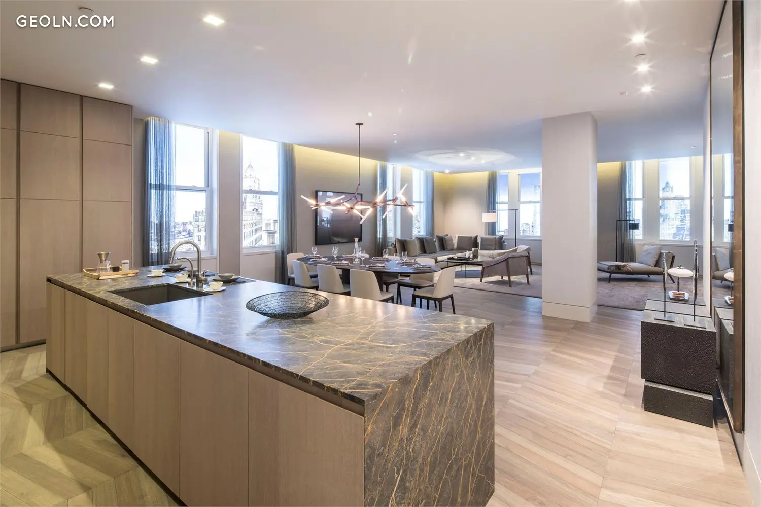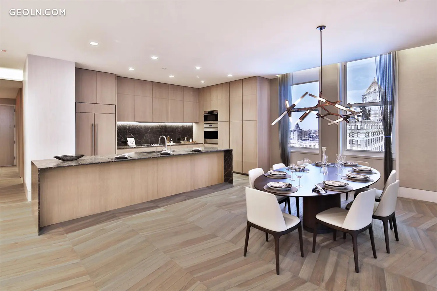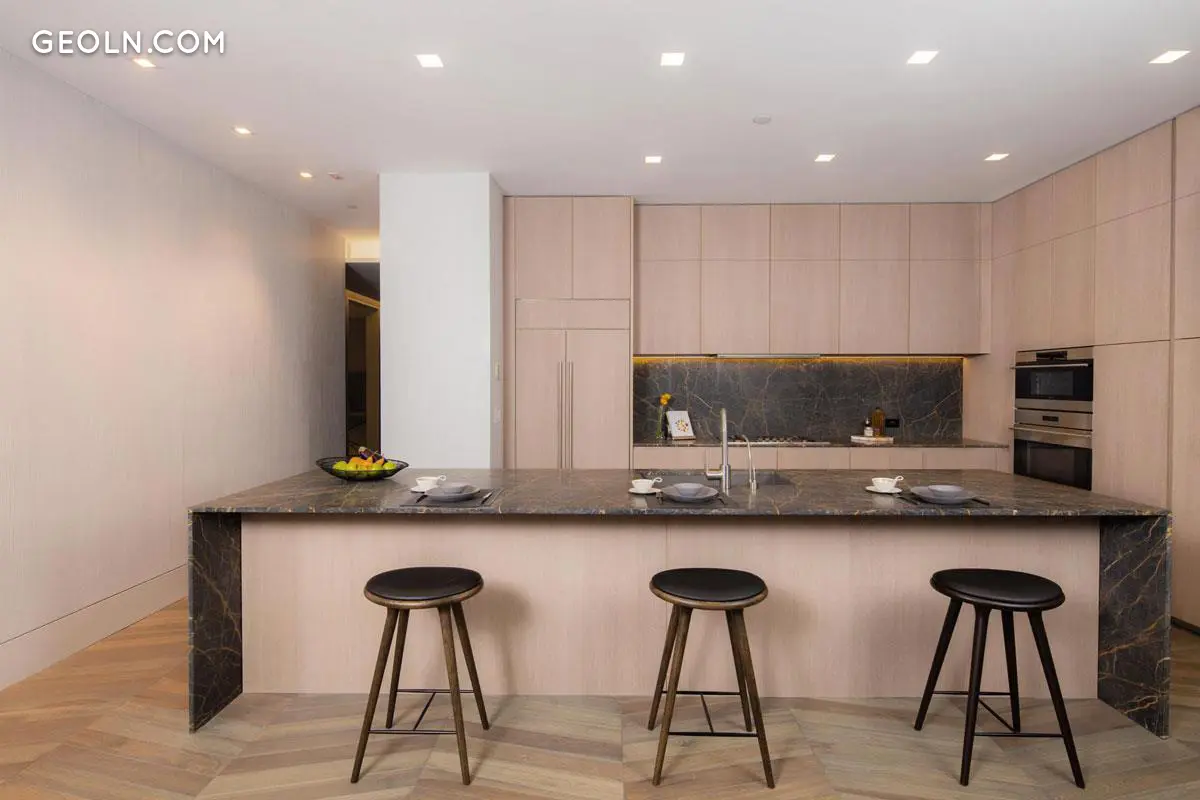 Most residences feature sleek and sculptural kitchen islands, wrapped in honed San Marino marble, with a spacious food preparation area, a Corian sink, and an extended countertop for casual dining.