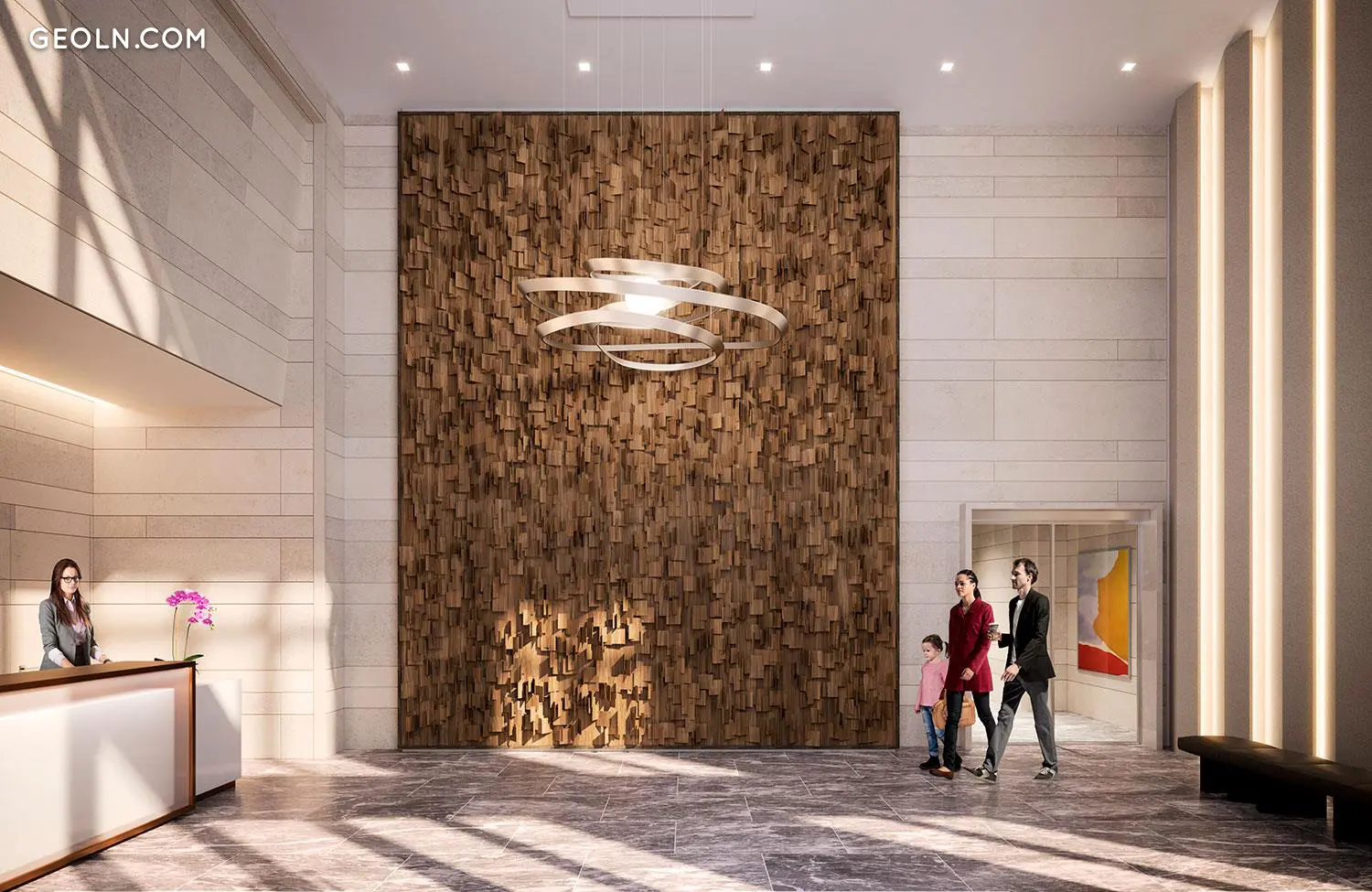 The façade introduces a new kind of exterior wall made from grandly scaled, imported European panels, allowing for greater articulation of angles inside the building. The cascade of floor-to-ceiling glass in a ziggurat pattern affords sparkling natural light in the homes and establishes a human scale at the street level.