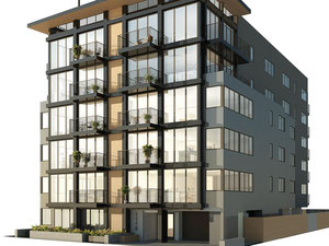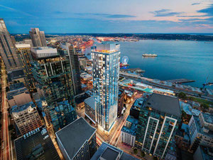 Some of the answers to these questions came together quickly. As a city mainly built in the twentieth century, concrete has long been the construction material of choice for such beloved institutions as the Pike Place Market, high-rise towers, college and university buildings, and the infrastructure of airports and overpasses. The design team decided that concrete building elements should be celebrated, shown with pride in public lobbies, even within private spaces of suites. Moreover, when concrete appears, it should be uncovered and unvarnished – direct and simple. Coupled with the exposed concrete, a rough aggregate warm-toned terrazzo is used as a highlight on some balconies and garden decks, including the lobbies.