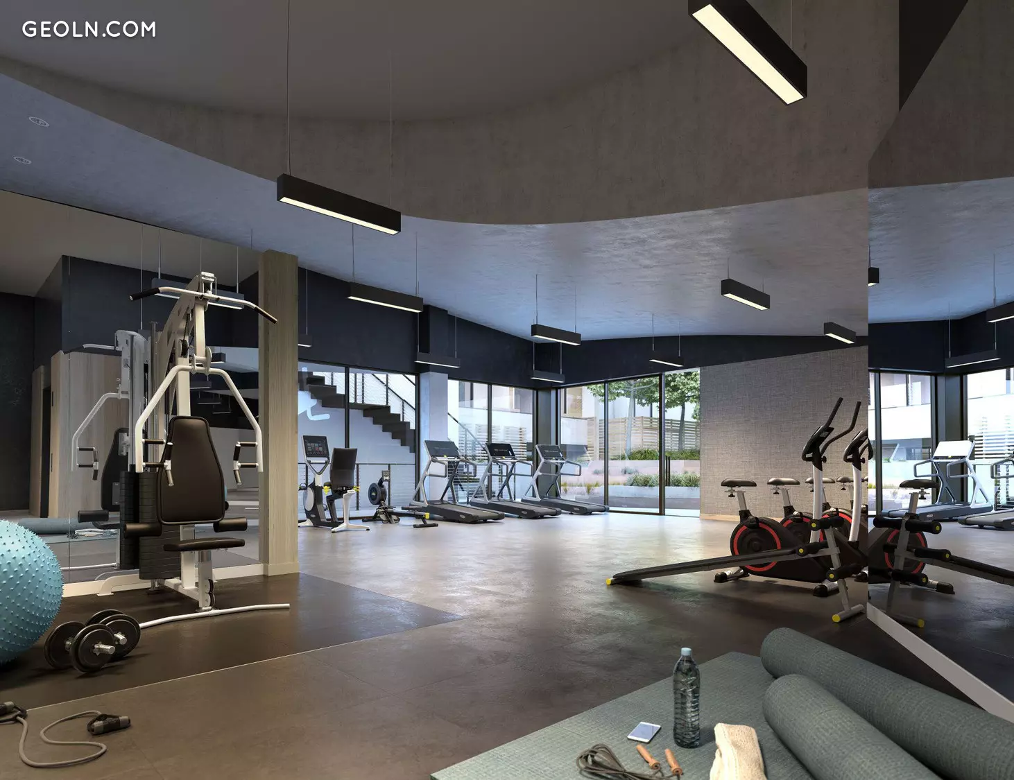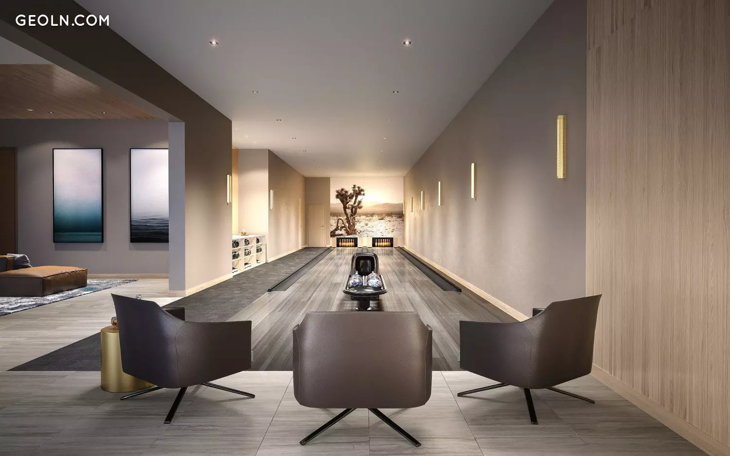 The award-winning architectural design features an undulating facade on Doheny with custom operable panels, and an elegant arrangement of wooden screens on the town homes along Harland and Keith Avenues. Residences are arranged around a large landscaped courtyard, and an extensive amenity program includes a fitness center, yoga room, private dining room, entertaining lounge and bowling alley.