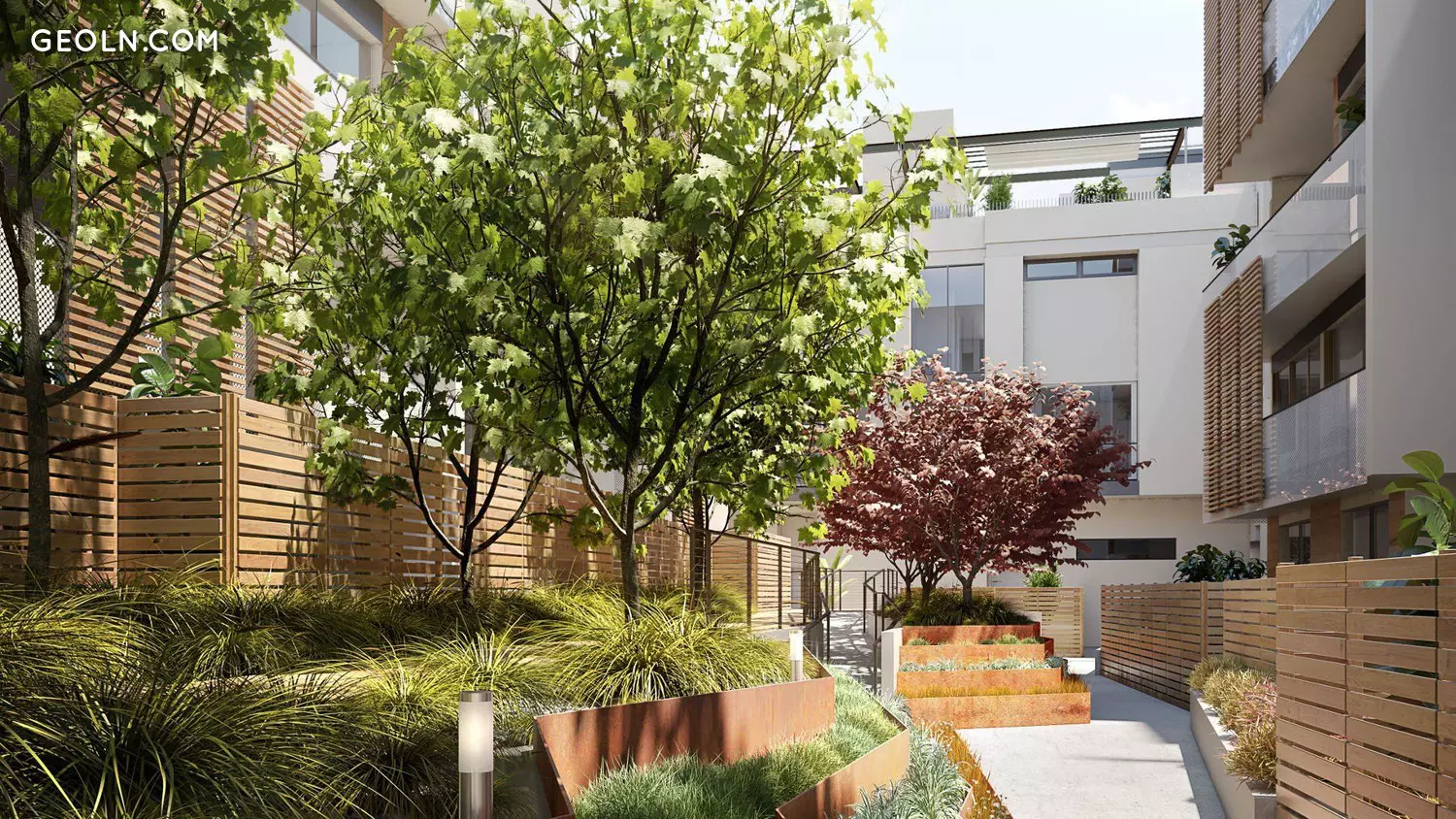 The East zone of the property is broken down into individual townhomes. Units are pushed nack onto the courtyard, increasing outdoor space and introducing opportunities for natural light. Portions of the courtyard extend to the street in order to provide the lower units with daylight. Each unit provides ample outdoor space and natural light.