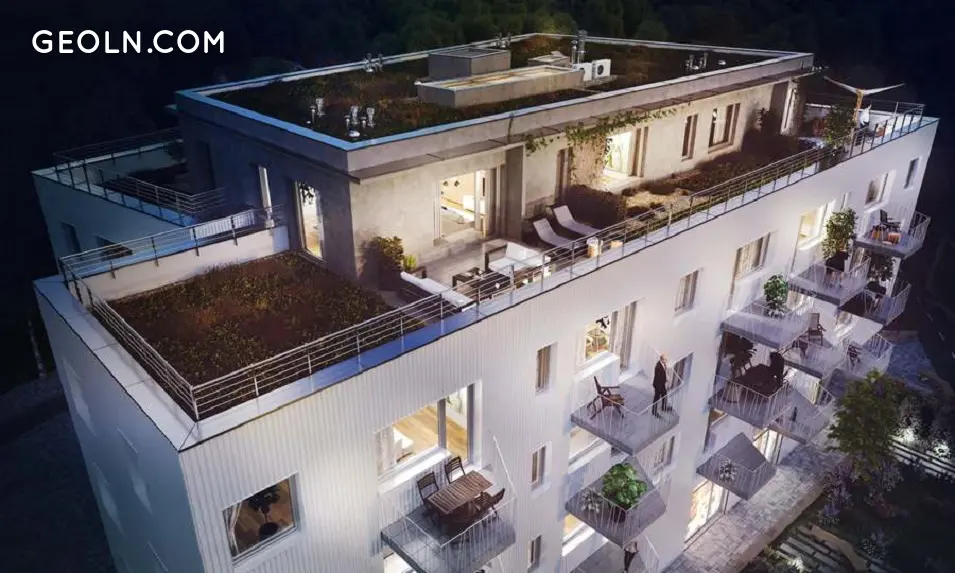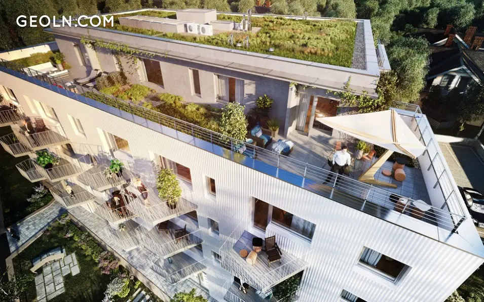 波浪形的白色立面和带阳台的阳台非常适合现代建筑和生活潮流。建筑物的顶层和屋顶上大量的绿色植物加强了与自然的联系。房屋的吸引力还增加了房屋中的停车位数量。