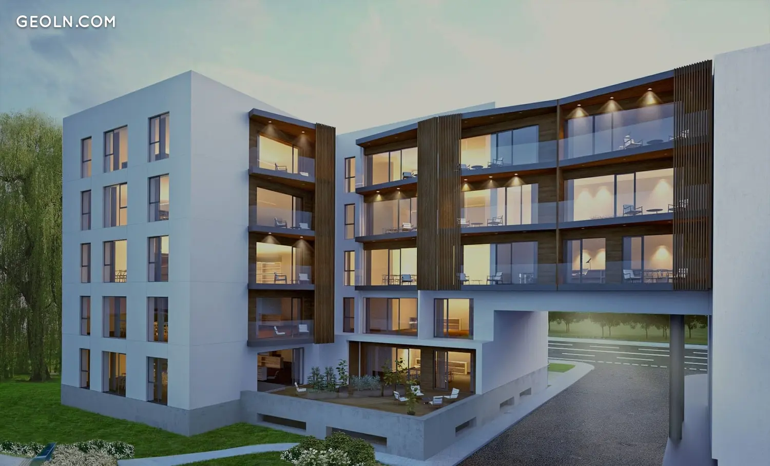 内角阳台的侧面设计为深色阴影墙,以创造隐私,而阳台的边缘则由透明玻璃制成,以创造空间。阳台的玻璃没有计划。就建筑物地下层旁边的计划垃圾填埋场而言,住宅主体(混凝土、金属屋顶)中的材料已被使用,因此垃圾填埋场与建筑物的基座融为一体,不会显得与通用架构解决方案。