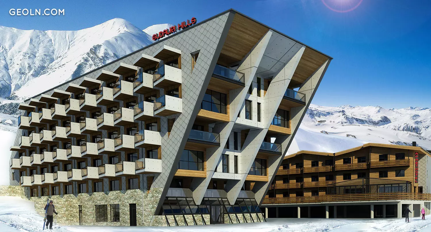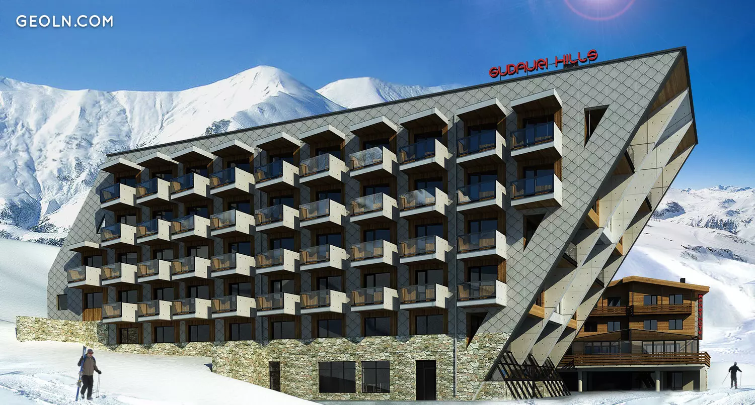 古道里山(Gudauri Hills)是一棟6層高的建築,注重美觀和性能提升。外牆使用額外的隔熱材料將使運營成本降低至少40%。裝有低排放玻璃的高質量塑料窗戶沿同一方向工作。外牆裝飾採用天然石材,木材和纖維混凝土,與周圍景觀和度假村風格完美融合。