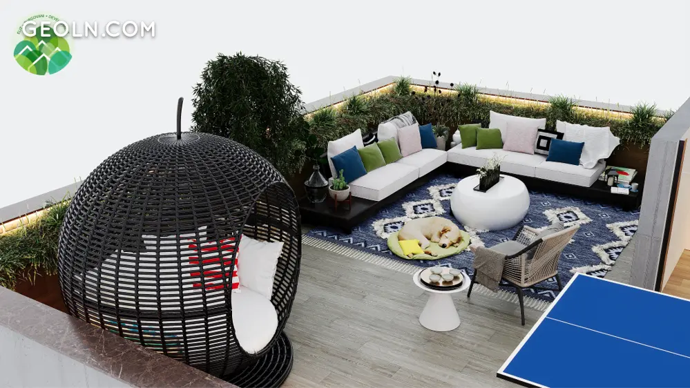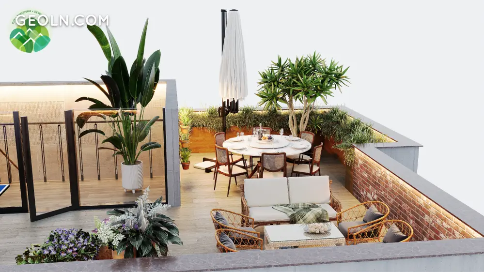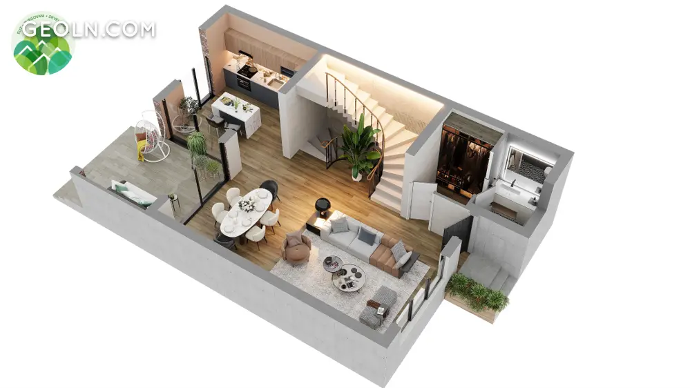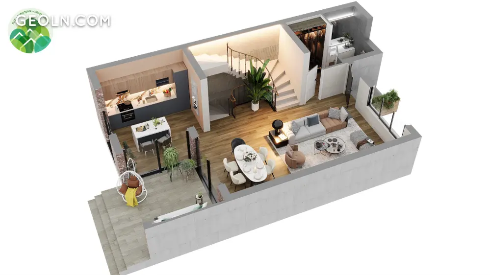 公寓包括居住空间、屋顶阳台、地下室、房屋后面的院子、停车位和房屋入口处的小花园。