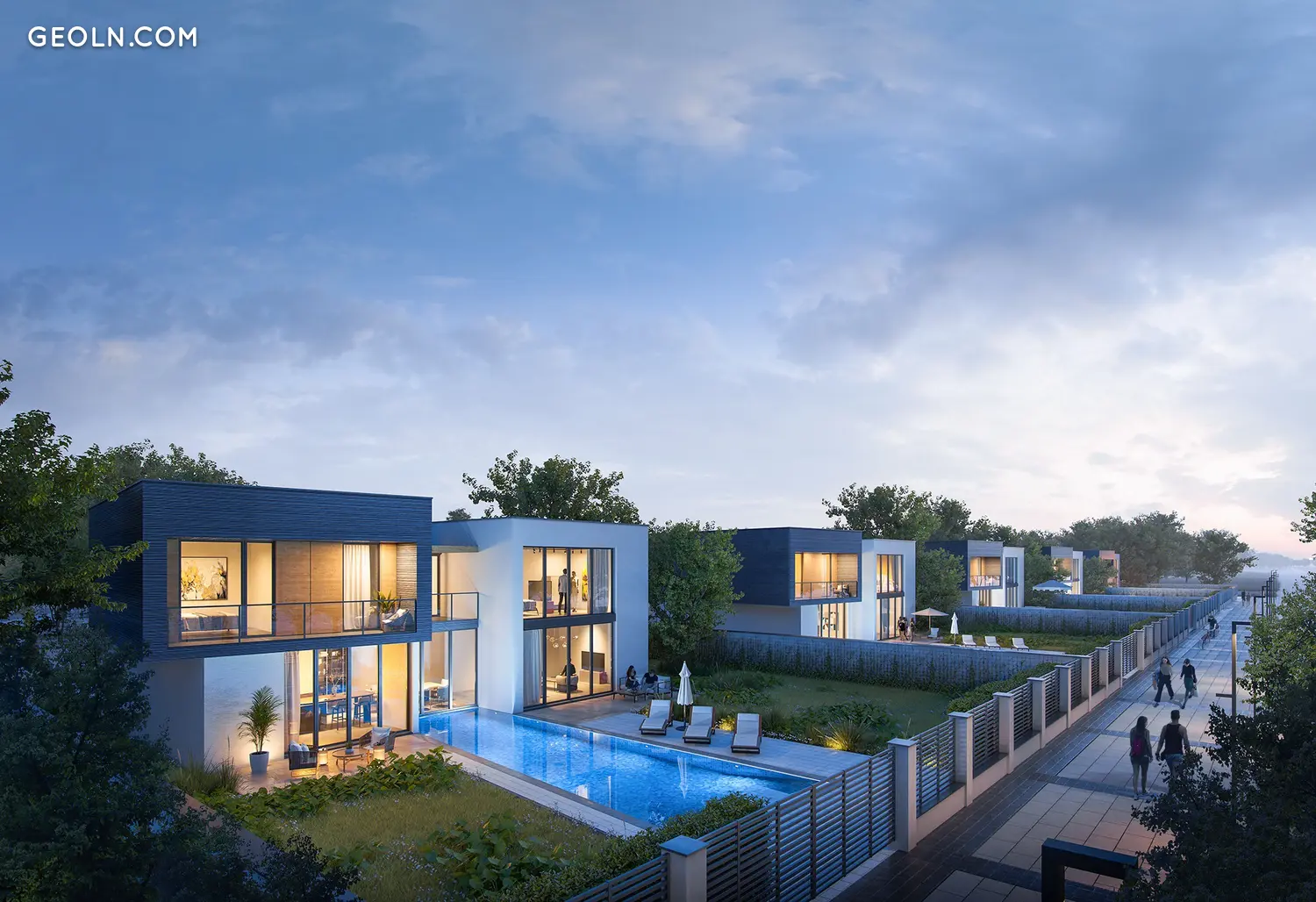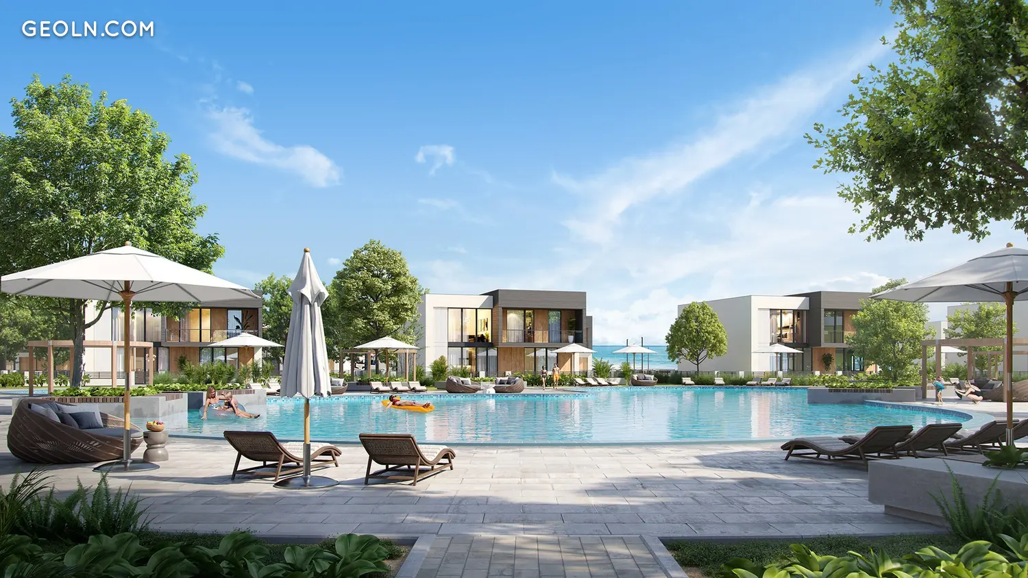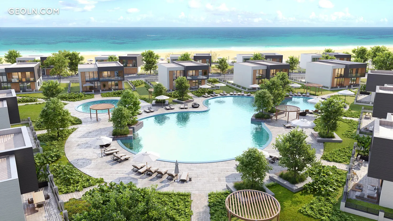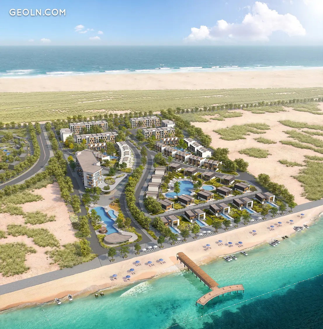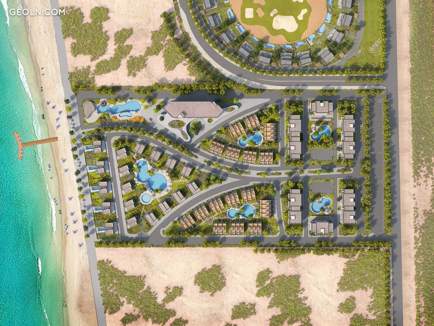 公寓式酒店、私人别墅、联排别墅和公寓分为几个私人区域。每个街区都有自己的带海水的泻湖游泳池、适合不同年龄儿童的游乐场、街头健身器材和休闲区。所有区域都由一条通往海岸和码头的步行大道连接在一起。