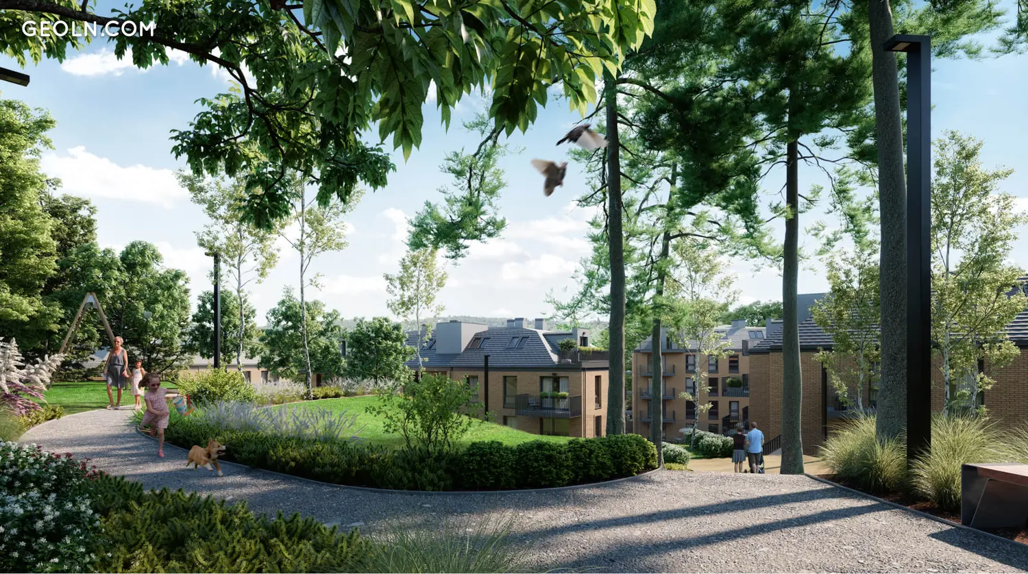 庄园被围起来,并发展成各种绿化。在上面建造了带有凉亭,吊床和长凳的公共休闲区,并采用了生态解决方案(例如雨花园,昆虫旅馆和筑巢箱)。居民可使用的花园图书馆,儿童游乐场,储藏室,婴儿车和自行车室,带有电动汽车充电站的地下停车场,地面停车位,自行车架和建筑物内的静音电梯。投资适应残疾人的需求。