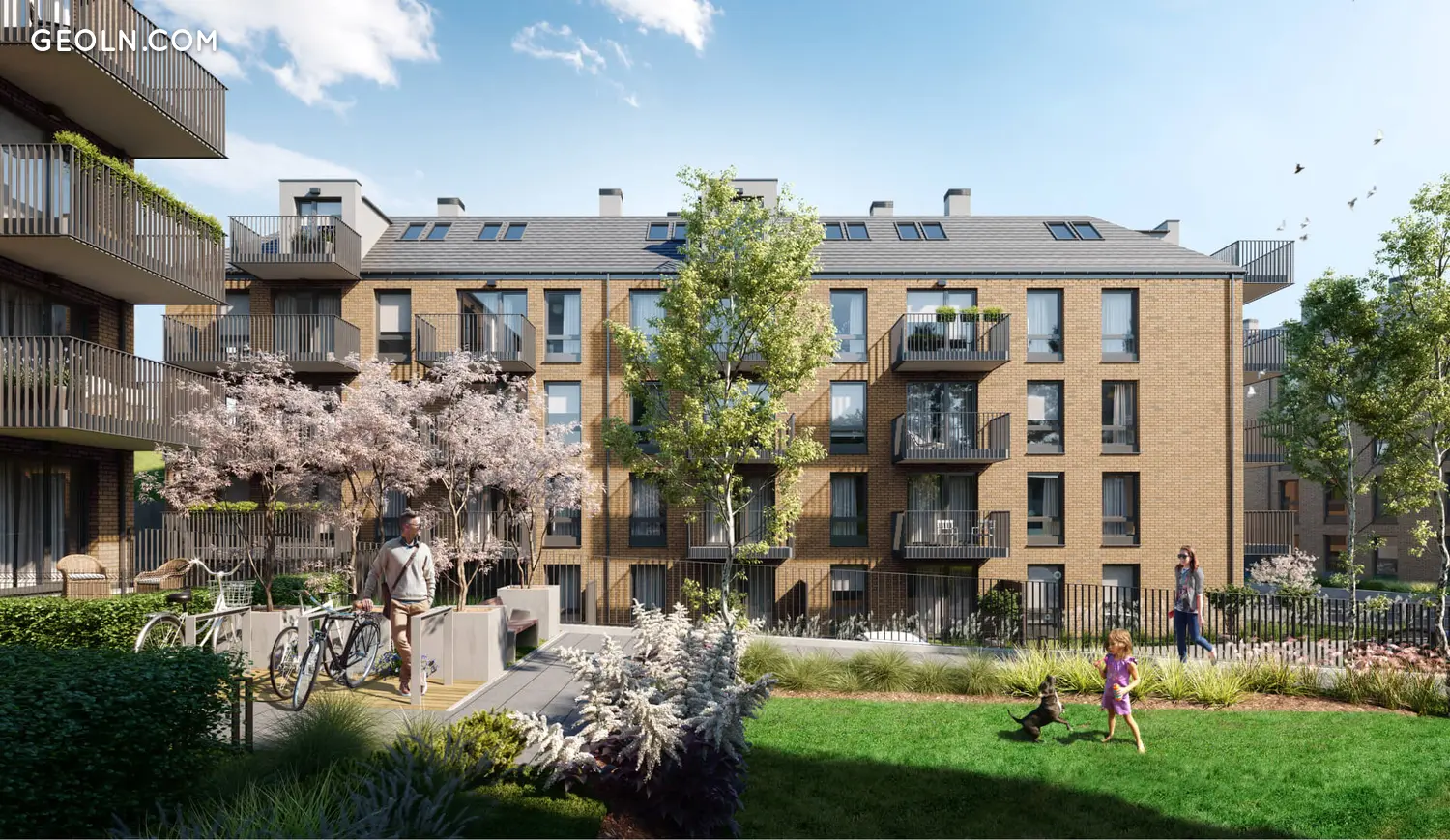 别墅开发的概念已被并入三层和四层建筑,其简约布局为简单的街区和带有天窗的倾斜屋顶。外墙使用棕褐色的熟料砖,大量使用玻璃,并添加了钢制或玻璃阳台栏杆。