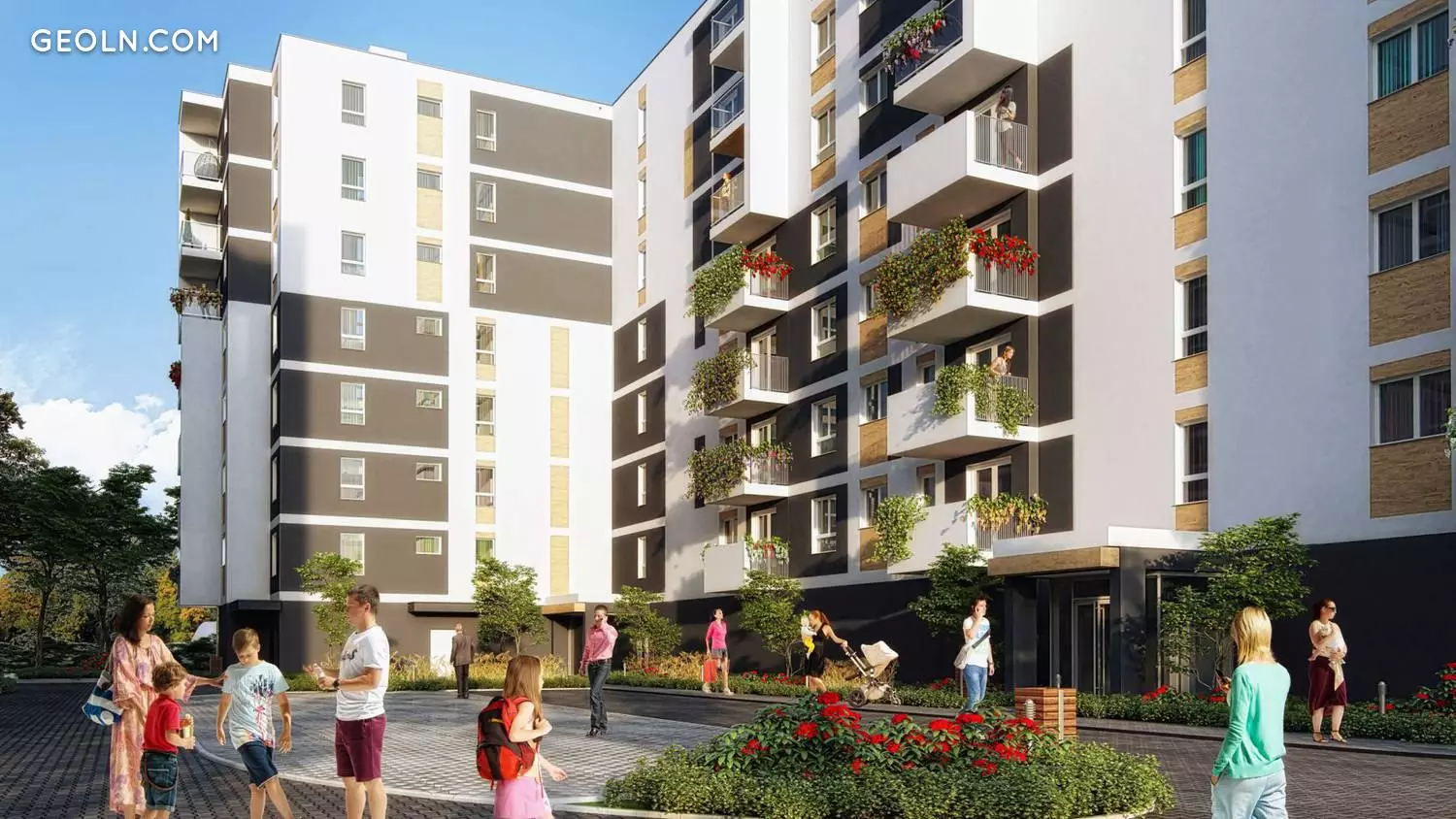 该庄园由7层多层家庭建筑组成,正在分阶段实施。建筑物拥有现代设计和鲜艳的色彩-白色,米色和灰色阴影。块之间提供长距离,服务场所设计在底楼。