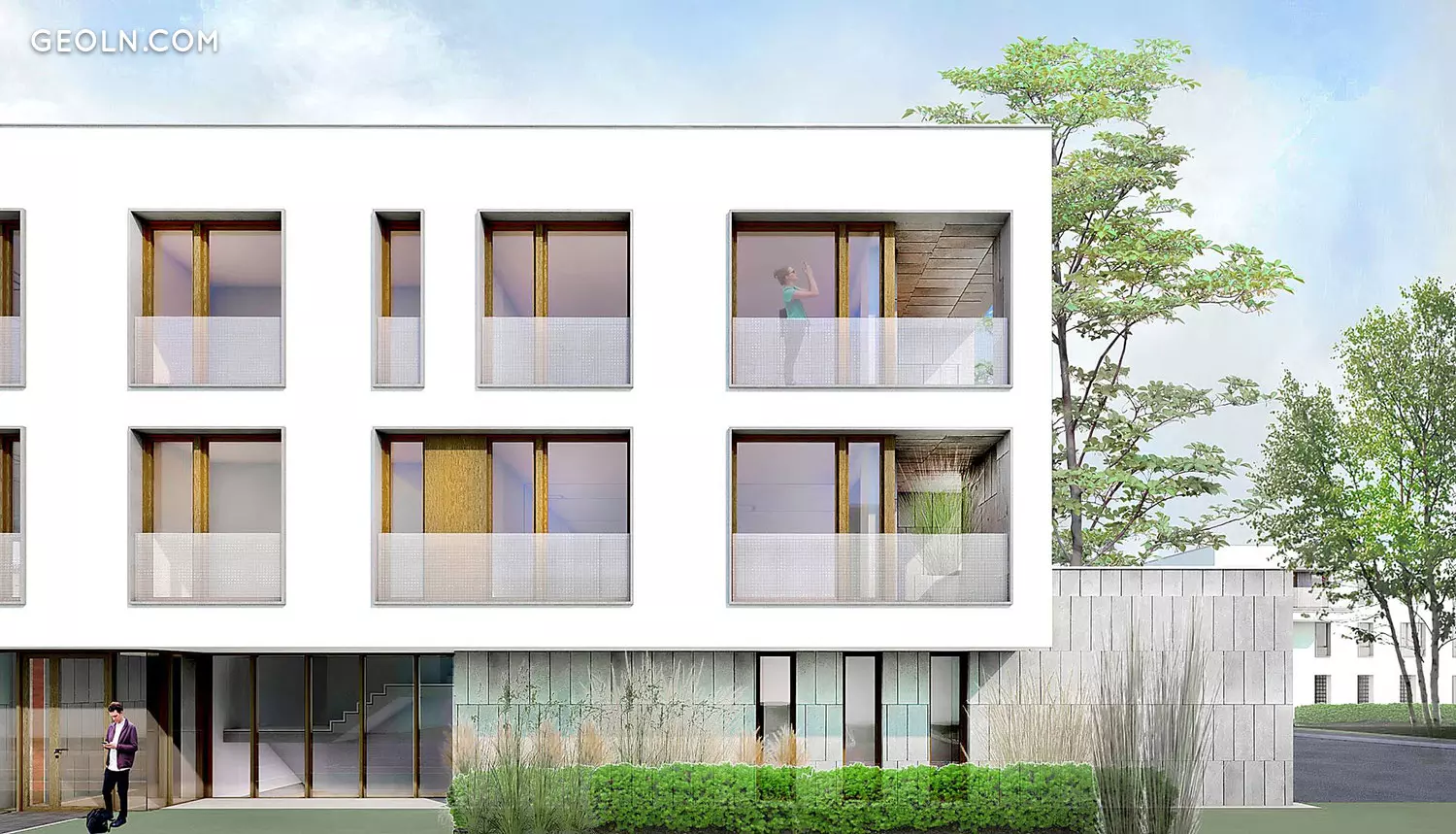 两层楼的别墅以简约的形状和简约的风格制成,并配有白色石膏。立面富含木质颜色的装饰元素。新增了玻璃阳台和露台栏杆以及全景窗户。