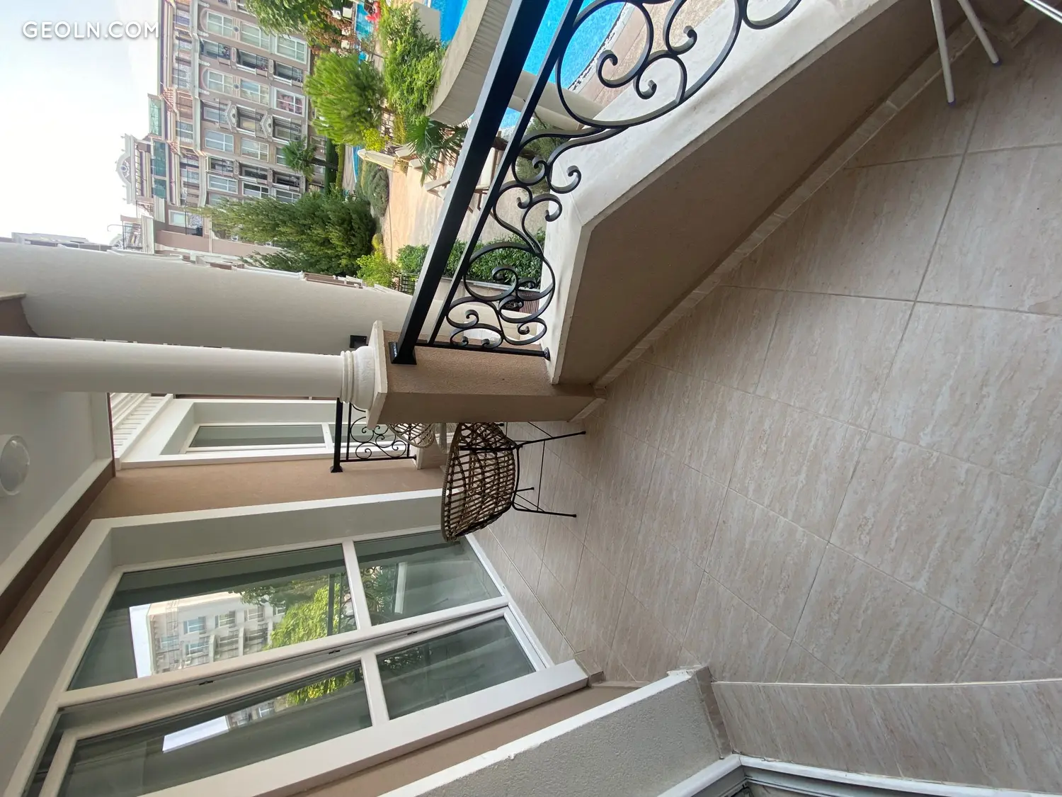 Квартира расположена на втором этаже и имеет следующее распределение: коридор, гостиная с кухней, 2 спальни, ванная комната с туалетом и душевой кабиной. Из гостиной и одной спальни выходит просторная терраса с видом на бассейн.