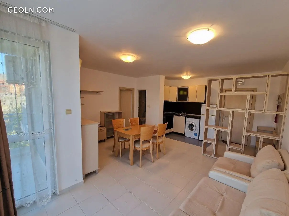 Квартира расположена на третьем этаже и продается полностью меблированной и оборудованной, следующей планировки - прихожая, гостиная с отдельной кухней и обеденной зоной, ванная комната с туалетом и душевой кабиной, спальня, балкон с видом на горы.