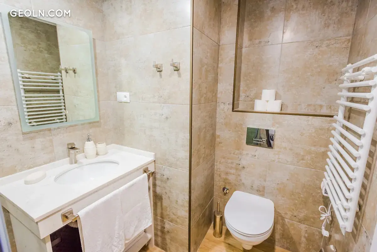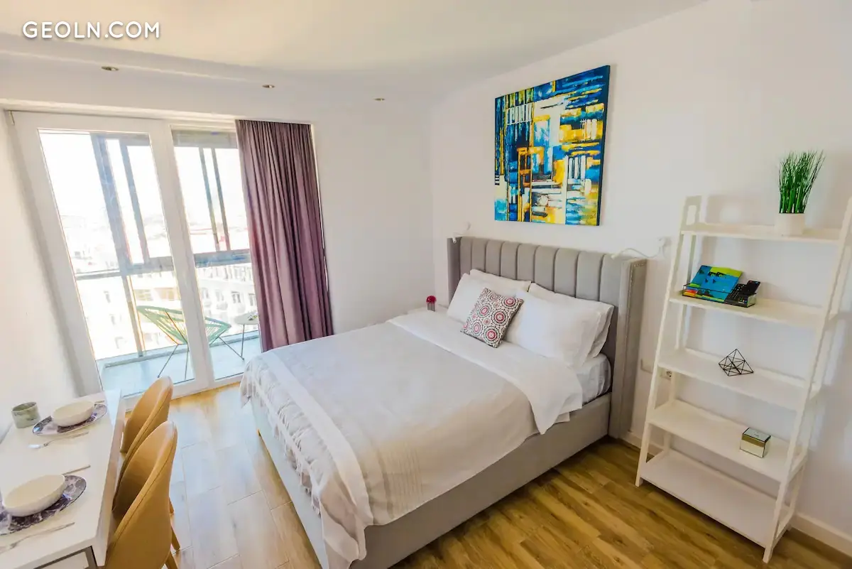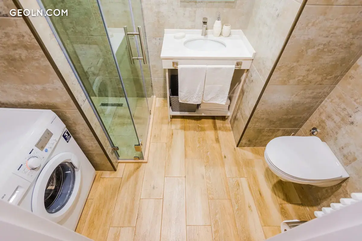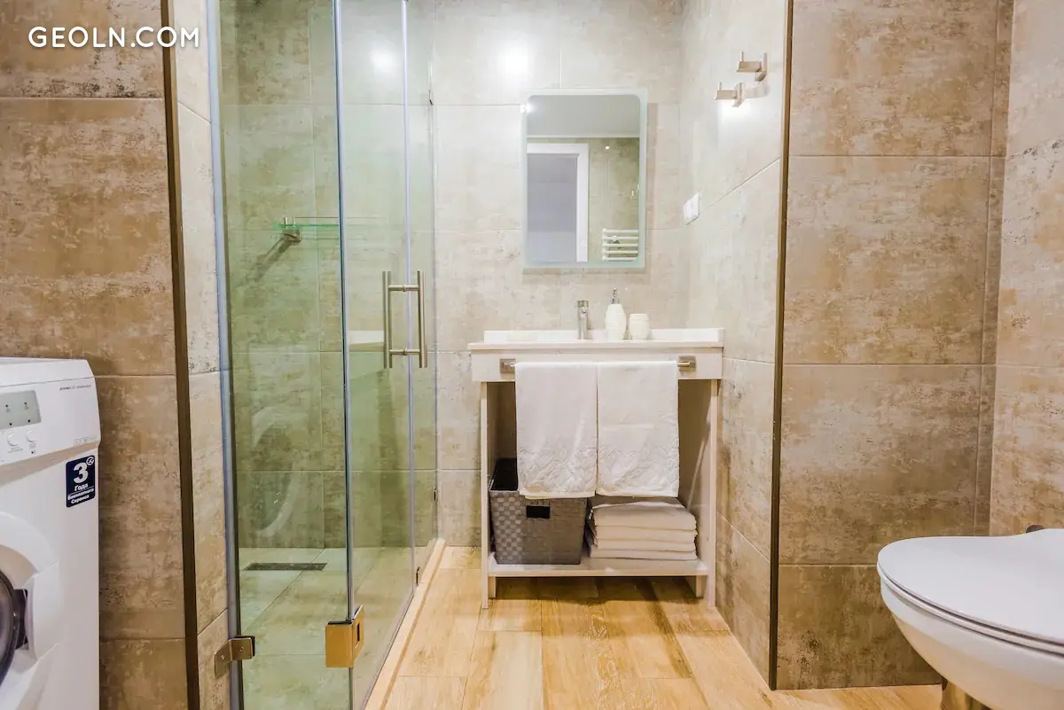 公寓有等离子电视、空调、免费WI-FI、洗衣机、烘干机、熨斗、吹风机、烫衣板、衣柜、衣架、毛巾、电热水壶、生活必需品
