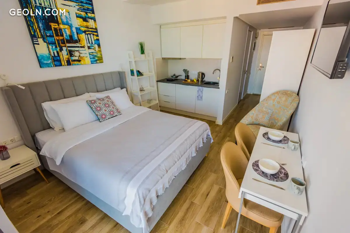 舒适的大床(160x200厘米)、带淋浴的浴室、宽敞的衣柜、用餐区、