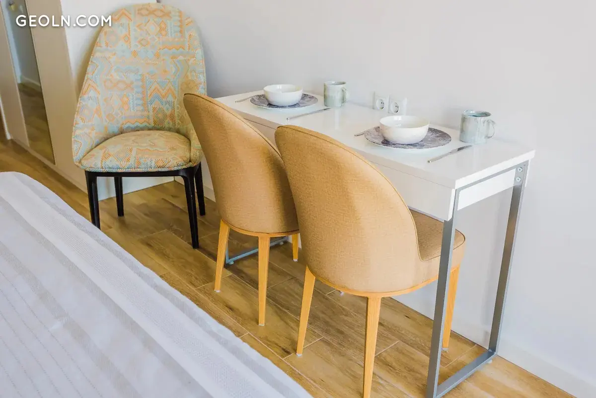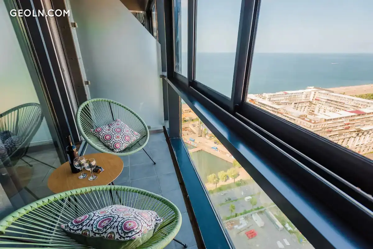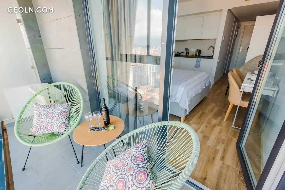 公寓设有带全景窗户的阳台,阳台上有两张扶手椅和一张桌子