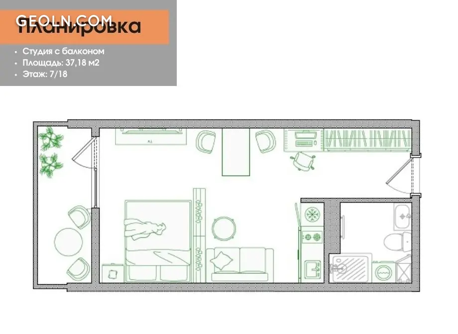 Студия большой площадью – 37,18 м², на которой можно разместить кухню с обеденной зоной, диван и двухспальную кровать, а также рабочий стол, зоны хранения и санузел 6 этаже, окна выходят во двор, но нет плотности застройки. Идеально подходит как для проживания, так и под сдачу в аренду.