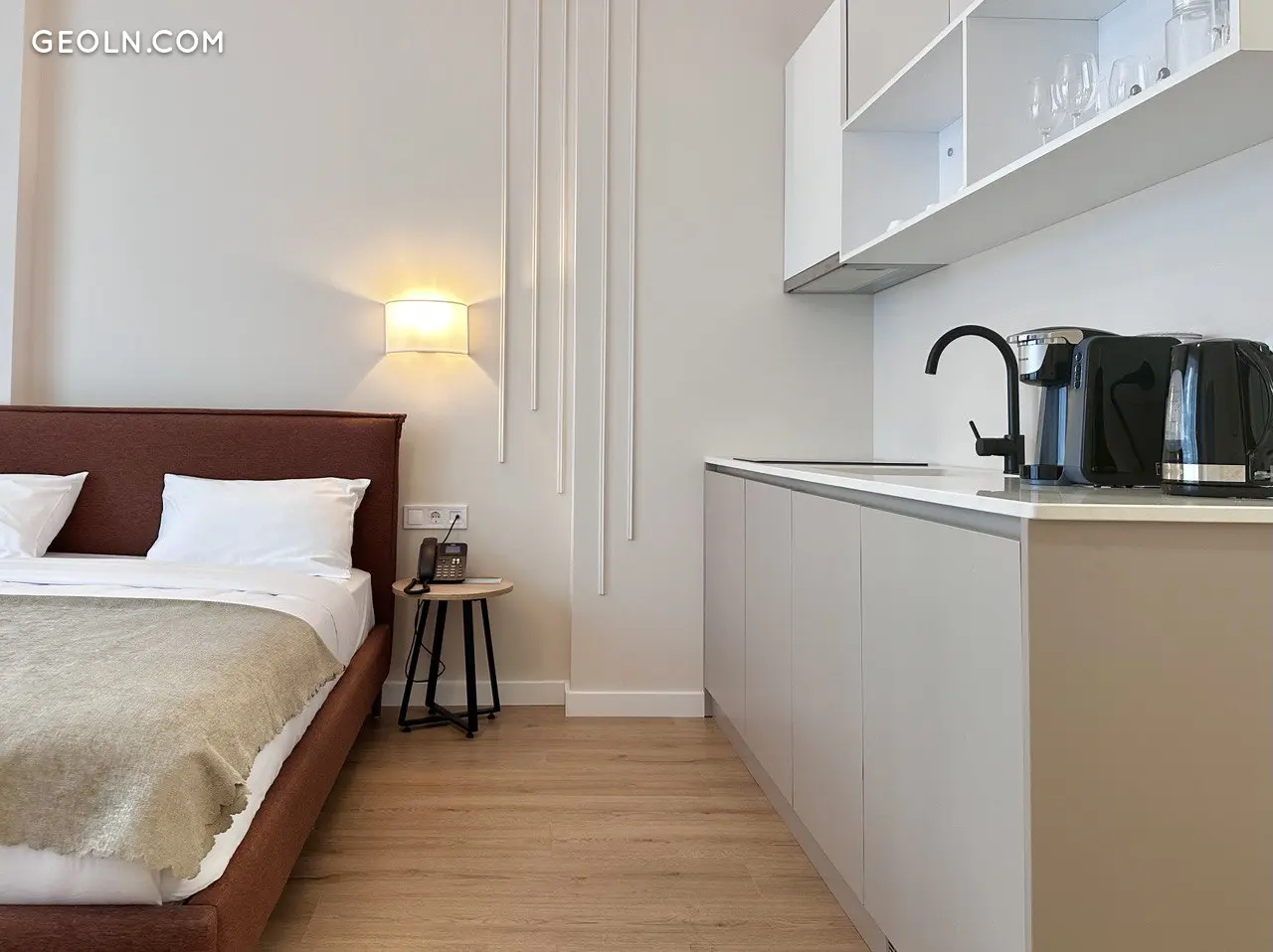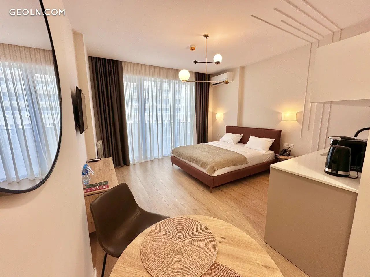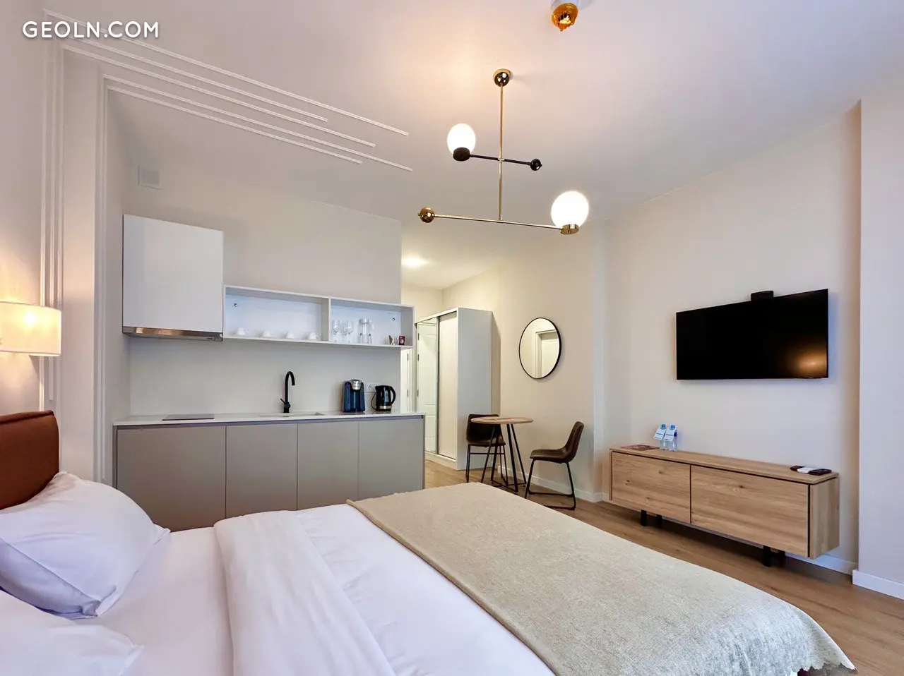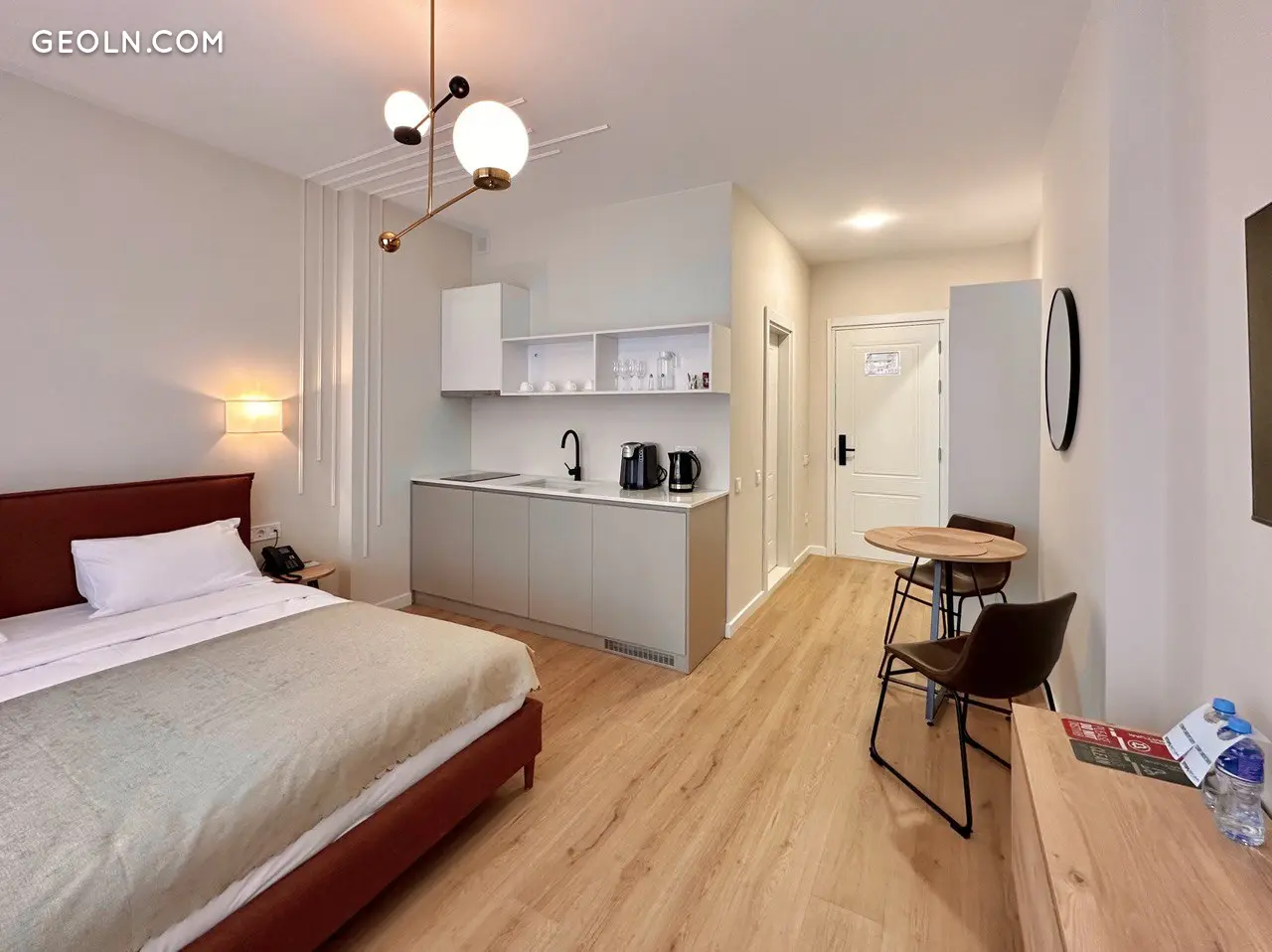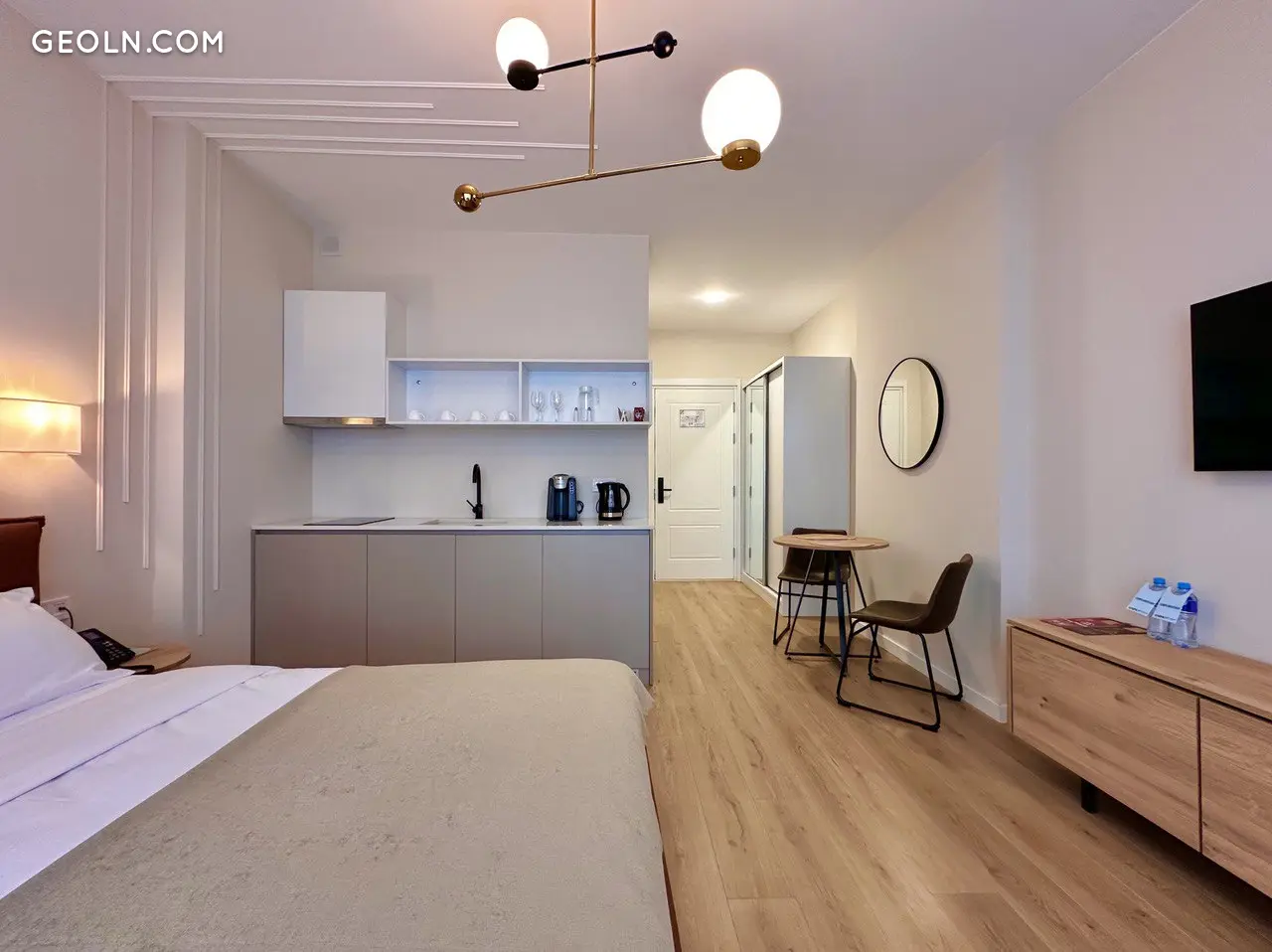 这间31.8平方米的公寓位于7楼,功能布局合理,配有一张全尺寸双人床和床头柜、宽敞的厨房和餐区、走廊的储物空间、卫生间和一个海景阳台。可以额外设置工作区或放置椅子。