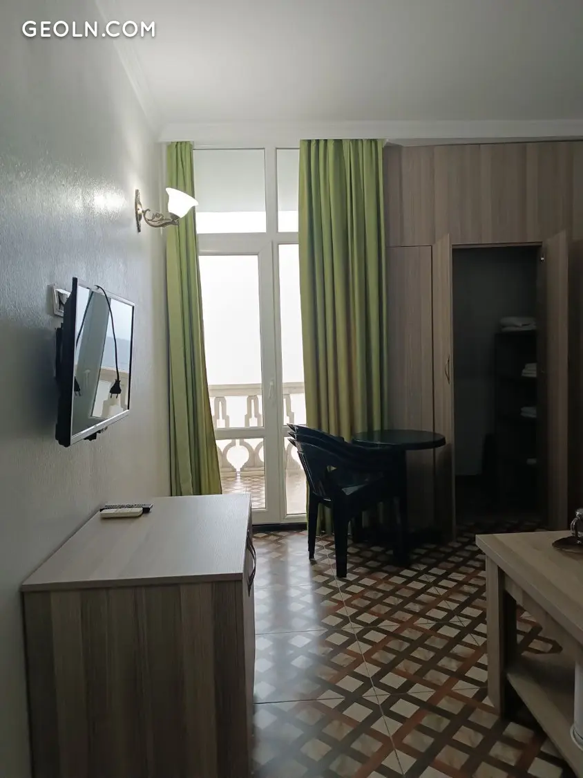 Во втором здании на первой линии есть несколько действующих номеров, 4-х этажный корпус, остальные номера в каркасе. Здание это уже достроено, осталось сделать отделку помещений, нужен ремонт. В этом здании 30 номеров, большой ресторан с витражными окнами на море, большая кухня со складскими помещениями и бар.