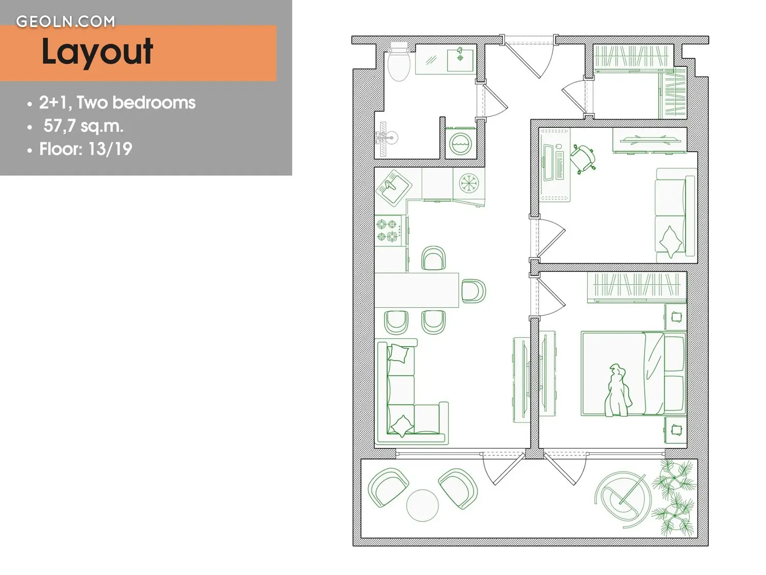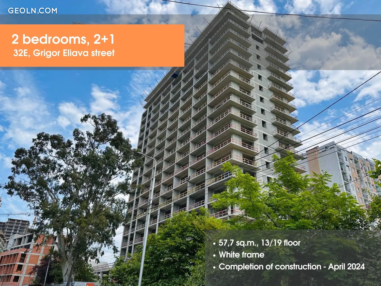 关于公寓。 Eurotreshka 57.6 平方米,设有 16 平方米的厨房客厅、两间 10 平方米的卧室和 9.3 平方米的大凉廊。不是尽头,位于 13 楼高处,窗户面向大海。公寓将进行预装修(白色框架)。
