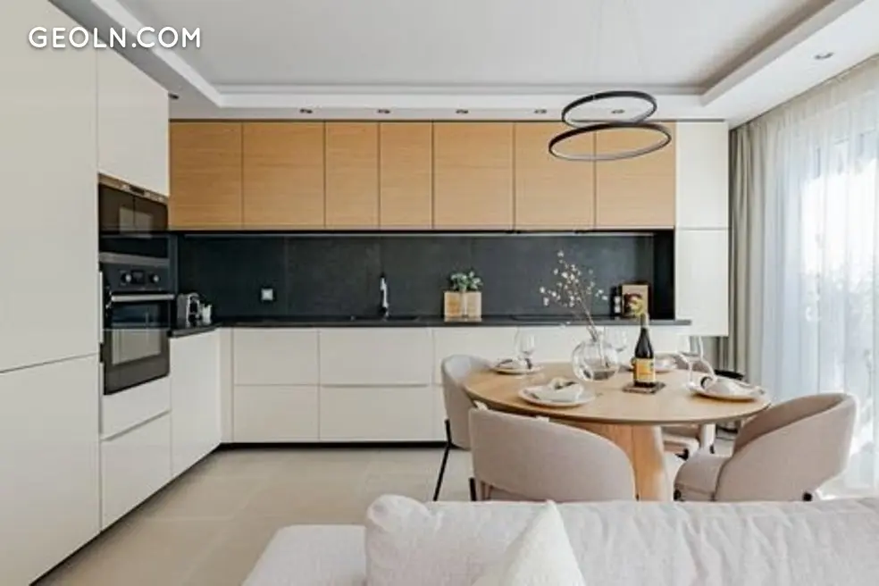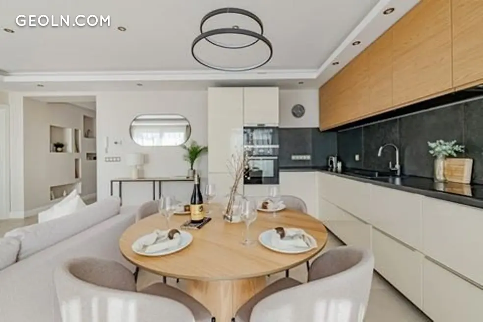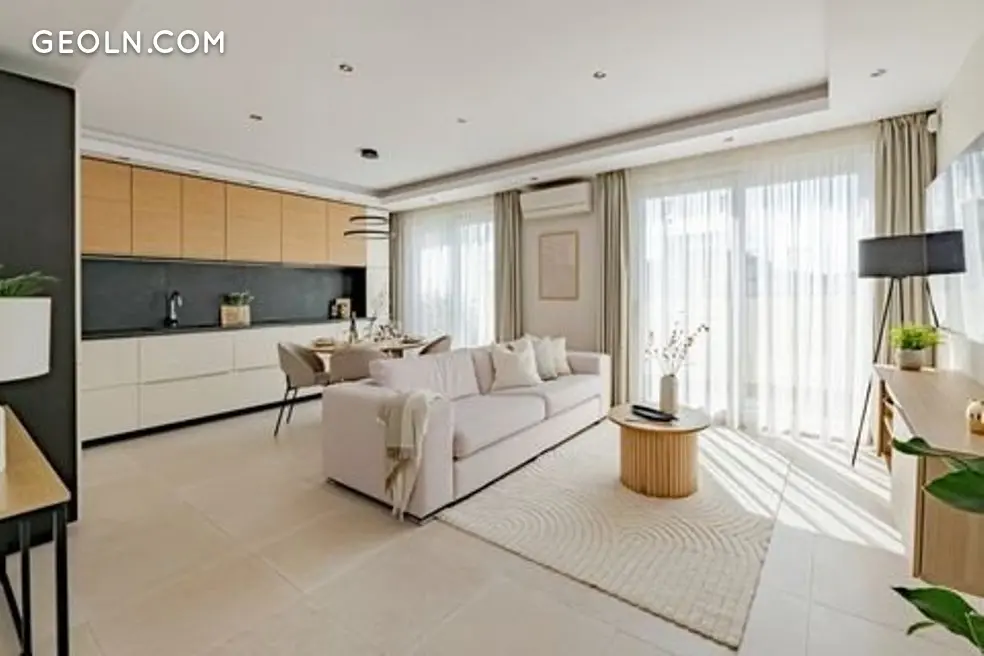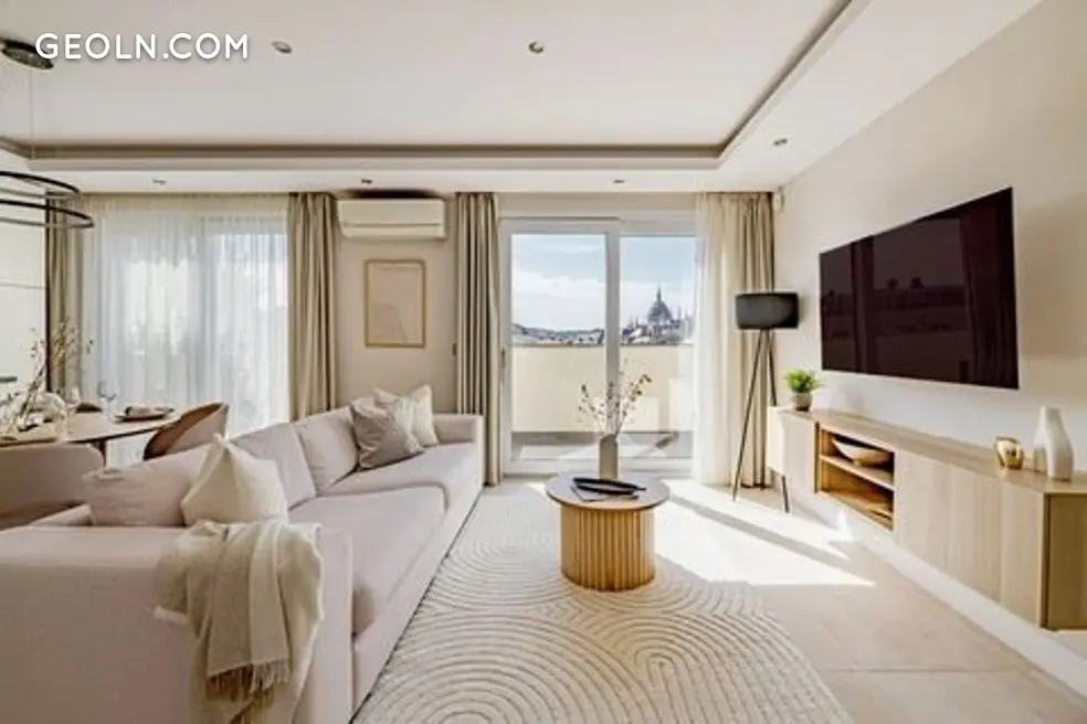 Гостиная и столовая с кухней открытой планировки выходят на юг и поэтому очень солнечная. Ее простор еще больше увеличивается за счет больших окон и дверей патио, выходящих на террасу площадью 11 кв.м. С террасы открывается вид на улицу Фальк Микса и частичный вид на Дунай и парламент.