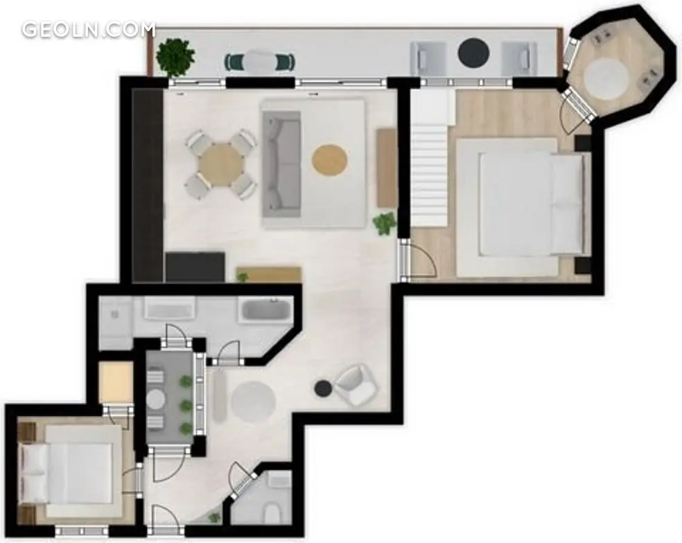 В галерее над главной спальней созданы кабинет и гостиная, а в небольшой угловой комнате башни — гардеробная. Есть вторая спальня с окнами во двор.