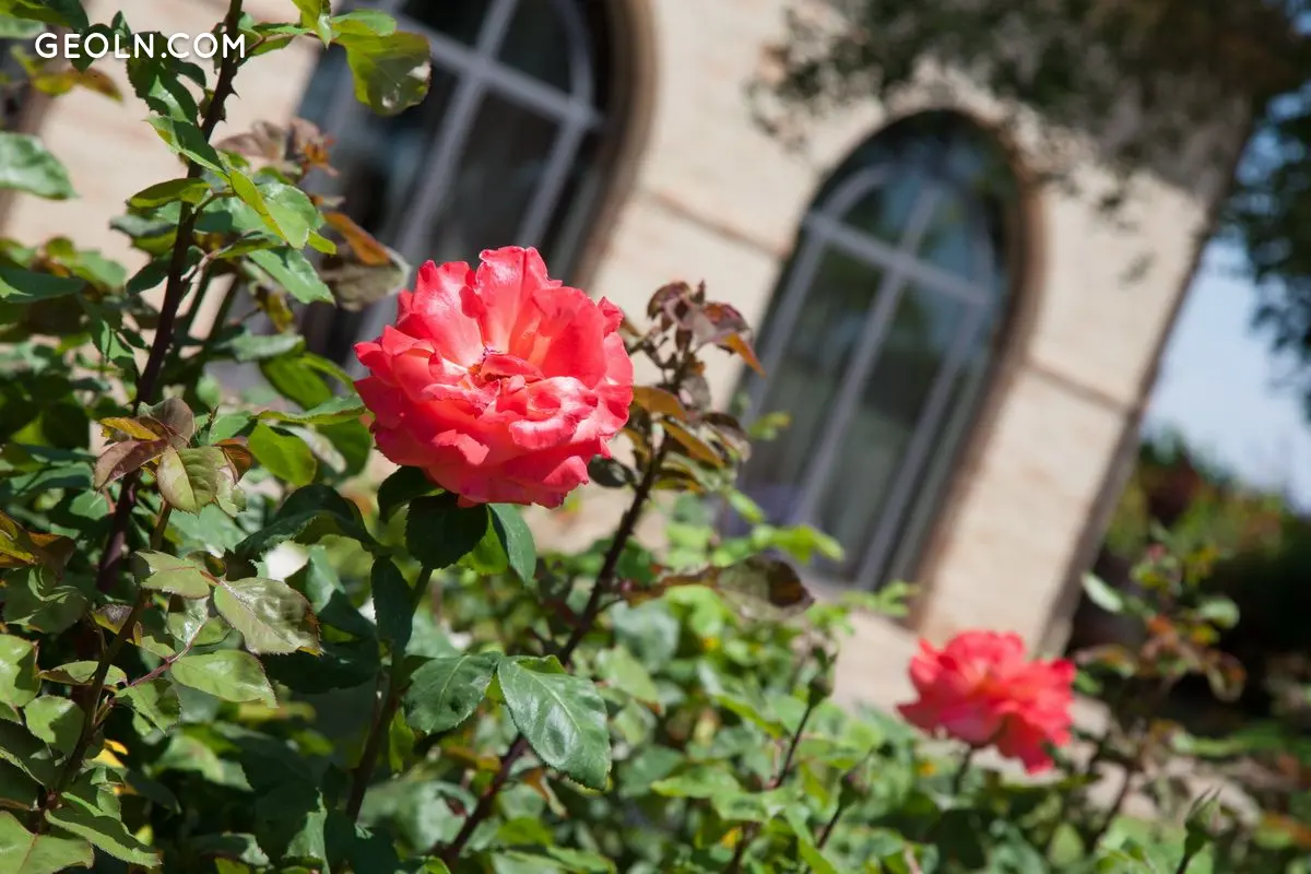 离主楼不远的是一个三层的附属建筑,有大拱形窗户、一个门廊和一个阳台。