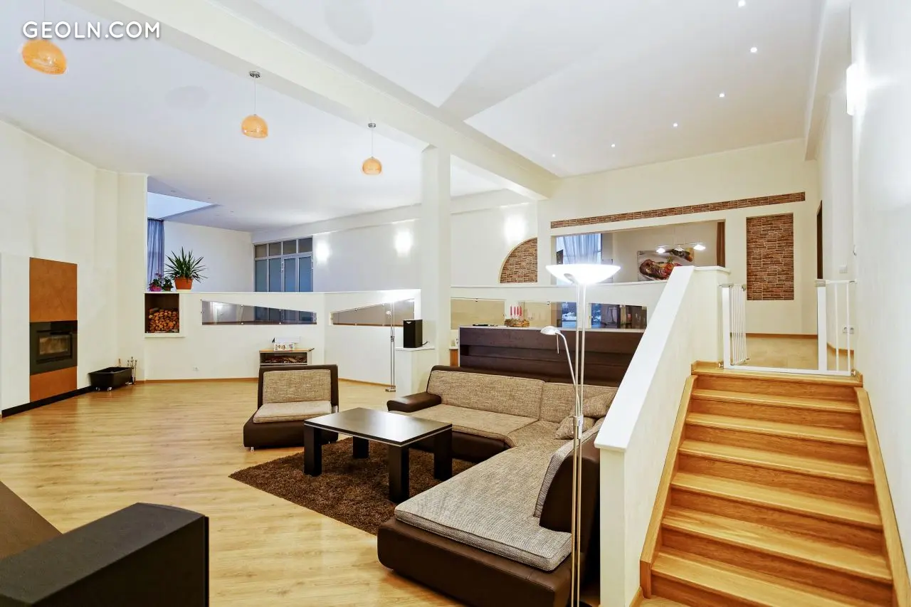 第二栋建筑有: - 一个大厅 - 一个带壁炉的大厅, - 一个厨房和一个餐厅,三个独立的房间,两个大浴室,一个健身房,三个内置衣柜。地下室有一个大车库,可停三辆车。