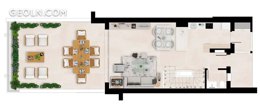 朝南的宽敞露台。 带有汽车空间和多功能室的私人地下室。 太阳能电池板、隔热和隔音、自然通风系统。 使用埃斯特波纳高尔夫球场服务和设施的特权。 C 型能效证书 第一阶段建设计划完成时间:2020 年 10 月