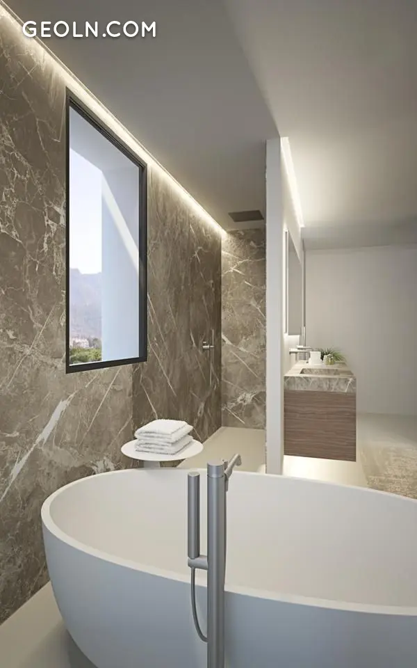 别墅的浴室配备了地暖,房子的其他地方也配备了空调/暖气。高品质防滑瓷砖、生活区瓷砖、双层玻璃、现代 LED 照明和家庭自动化系统。但是,业主可以对别墅的设计和装修提出建议,例如选择颜色和材料,在浴室和厨房安装家具。