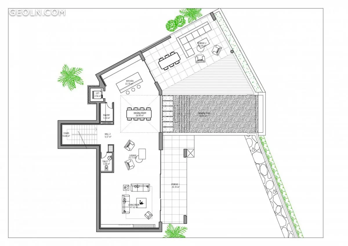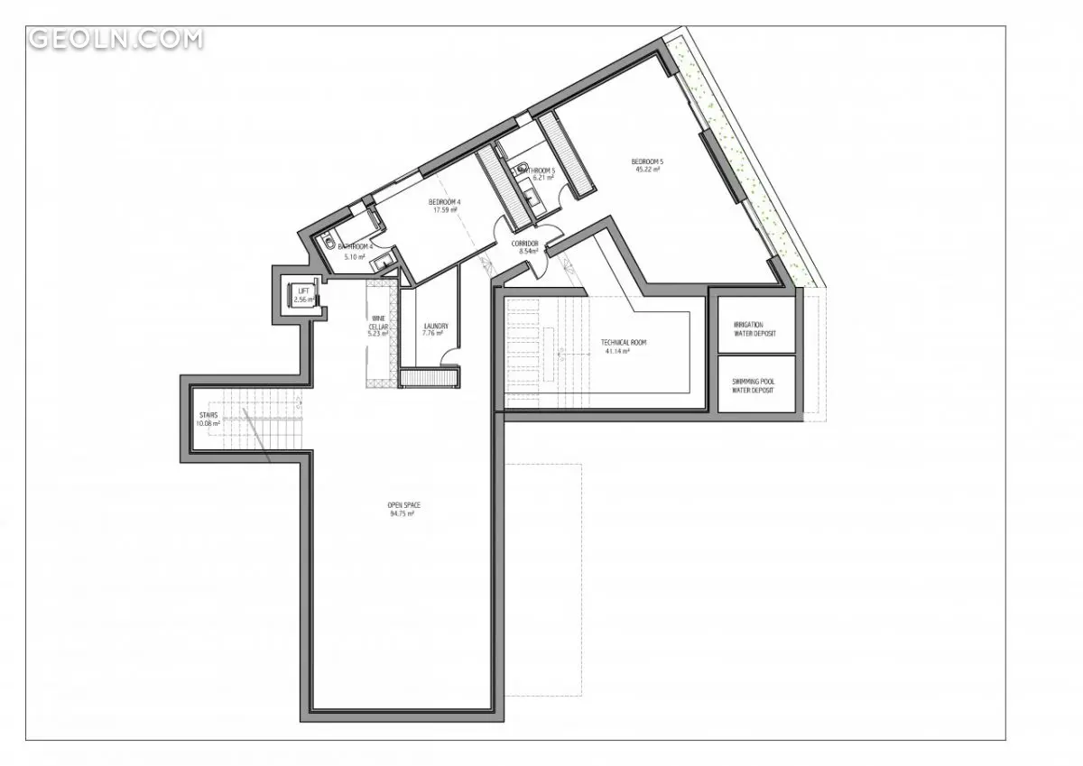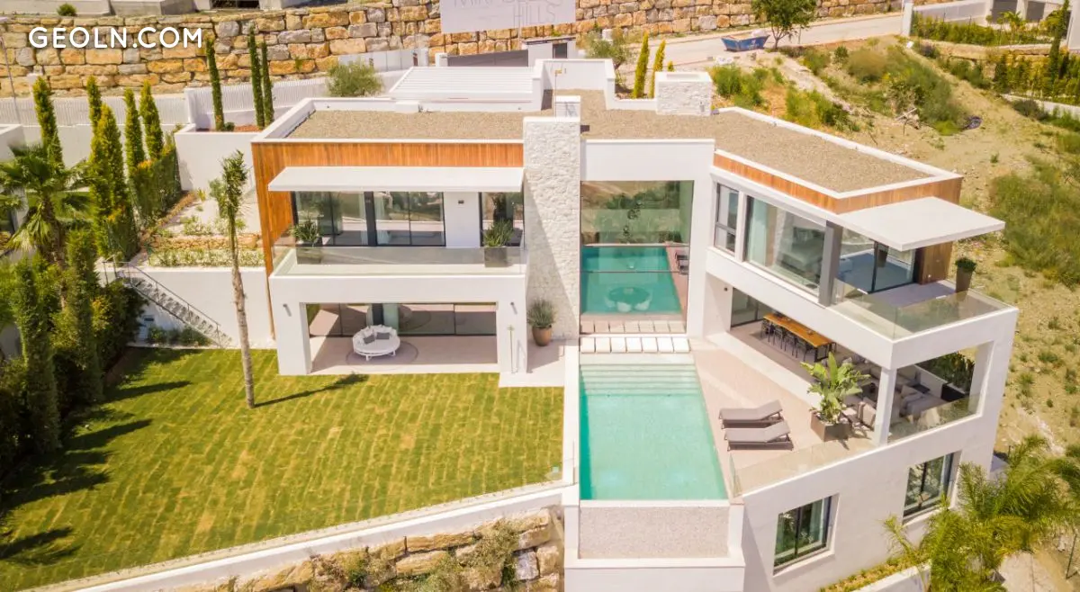 构成别墅建筑和内部的内部线条采用优质材料,极其注重细节和质量。在 1,573 平方米的地块上有一个 303 平方米的宽敞地下室和一个巨大的开放空间。