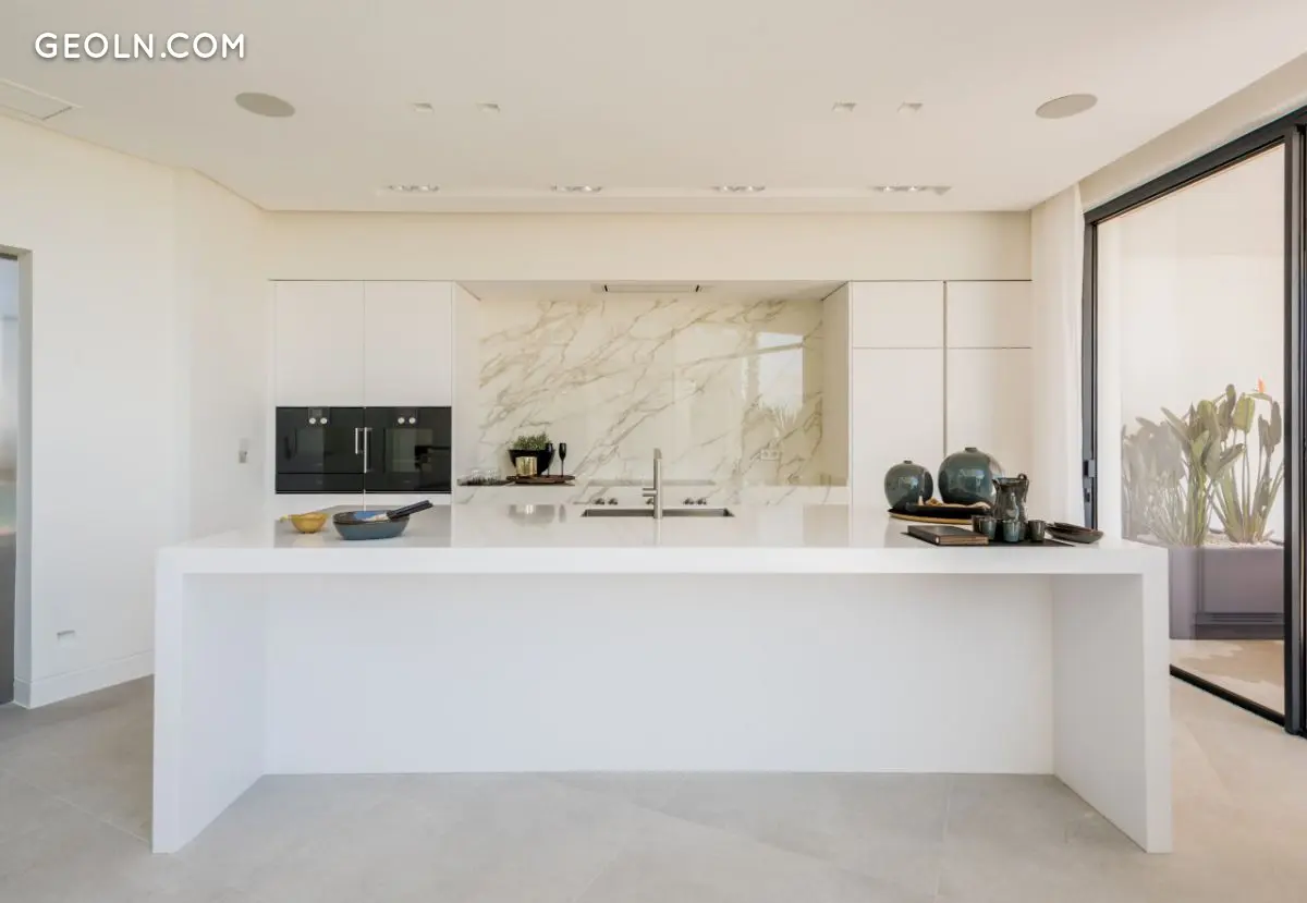 宽敞的美食厨房以奢华的卡拉卡塔大理石装饰,并配备了所有嘉格纳电器。带落地窗的用餐区营造出空间感和光线感。起居区配有壁橱、内置 Loewe 电视和壁炉。