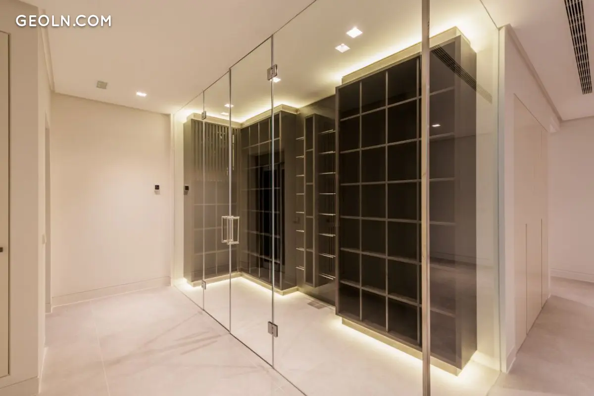 303 平方米的大型地下室,配备空调、酒窖、技术室、洗衣房和另外两间带浴室的卧室。其中一间是一间 45 平方米的大卧室,有两扇高窗和法式阳台,可俯瞰高尔夫球场和地中海。大型开放式空间(95 平方米)靠近楼梯和电梯,非常适合设置健身房、健康中心、家庭影院或额外卧室。