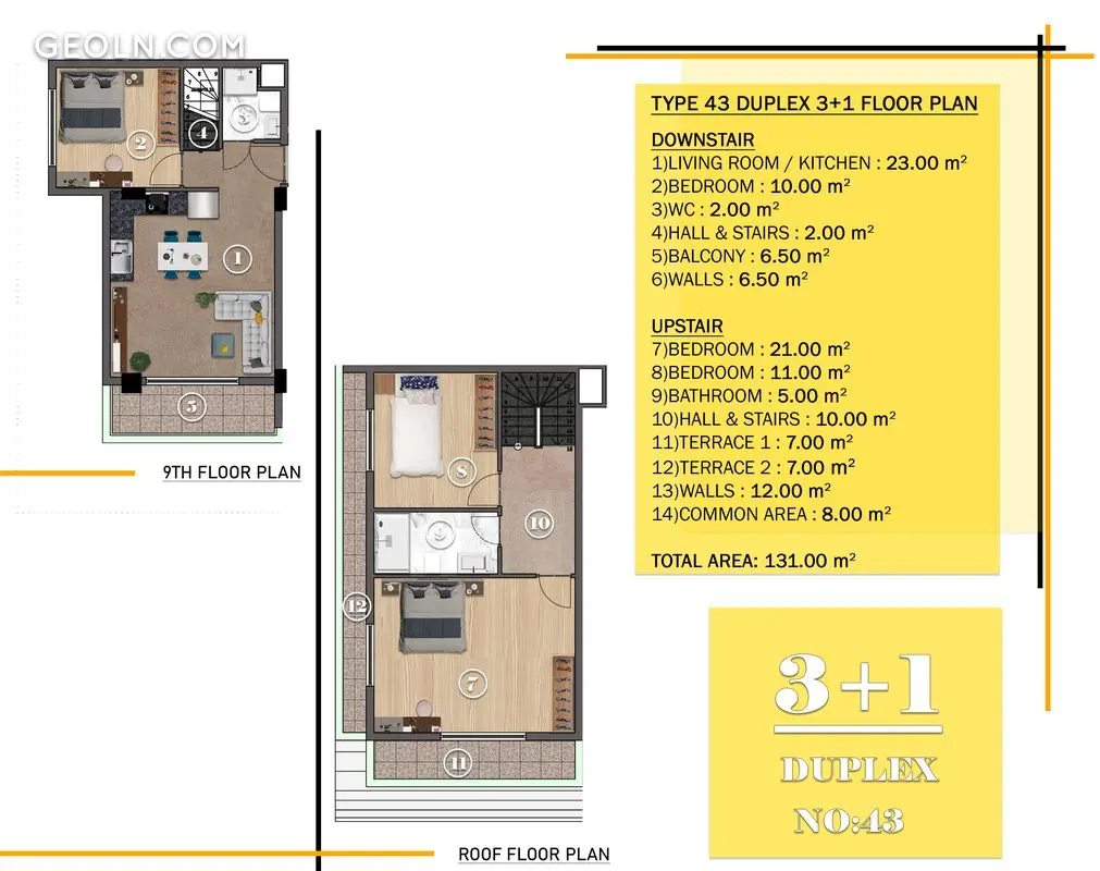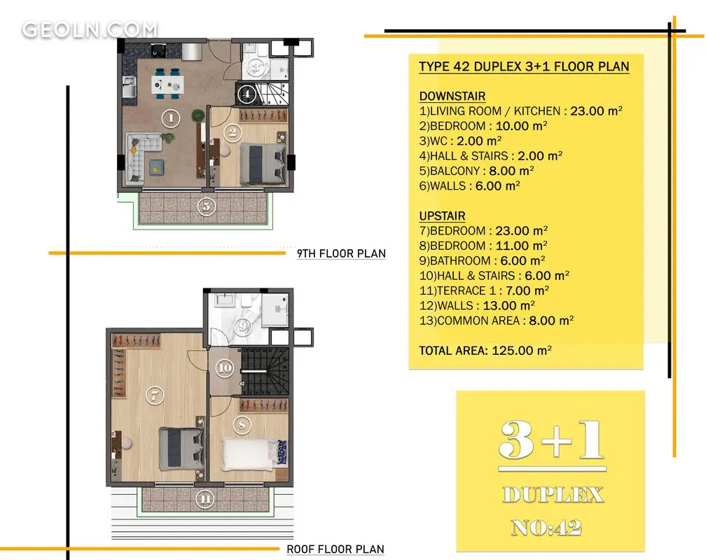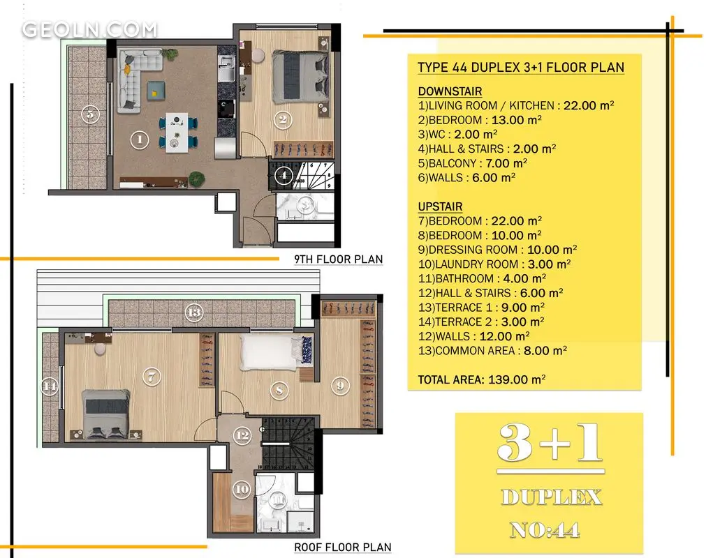 - 3+1 复式 - 6 公寓,125 平方米,131 平方米,139平方米