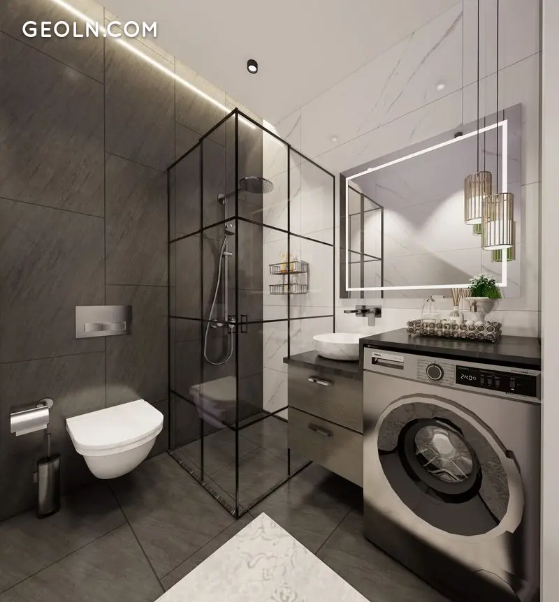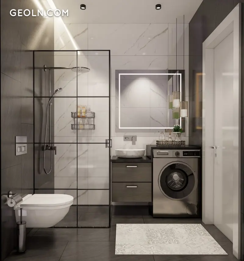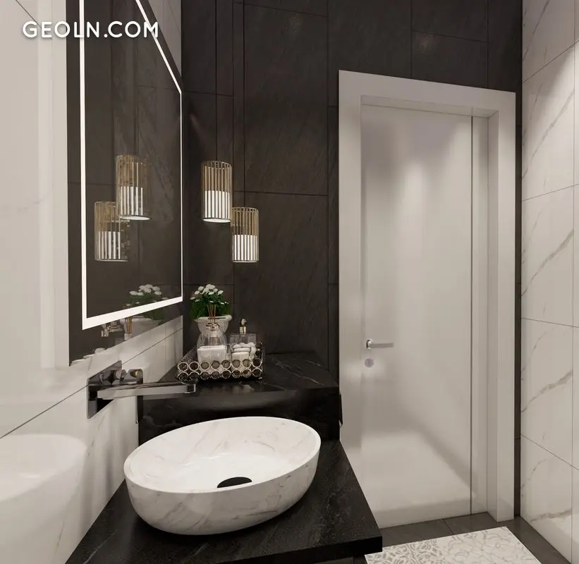 - 地板上的陶瓷 li>天花板上的聚光灯 + LED 照明