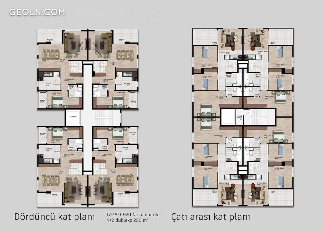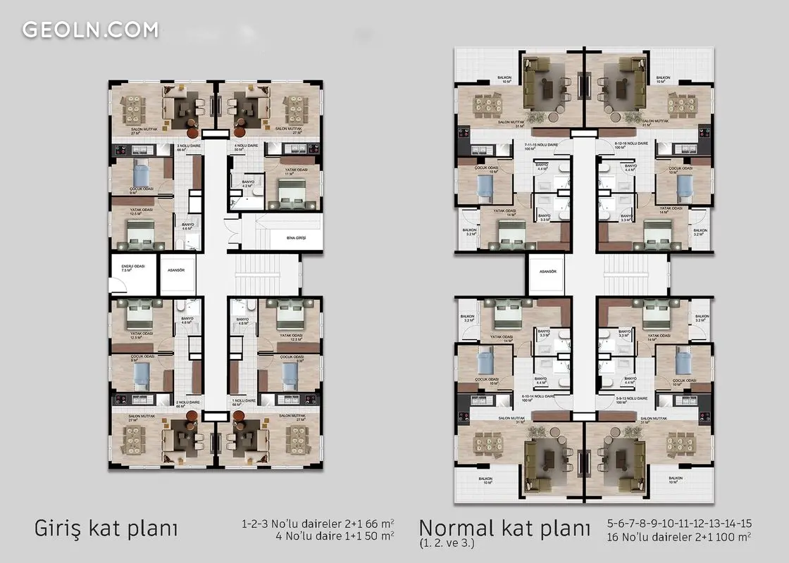公寓的外门为钢门,将安装 TSE 1 级钢门。窗户和百叶窗空箱将根据项目放置。门窗将采用双层玻璃。客厅和公寓的内门将是美式的。外部细木工是 TSE 1 级标记;它将根据外部要求由一级材料制成。栏杆和窗台将使用一等大理石。