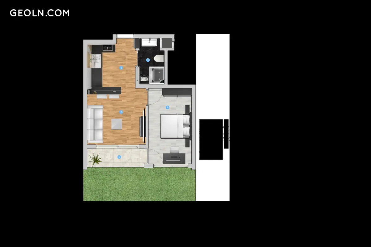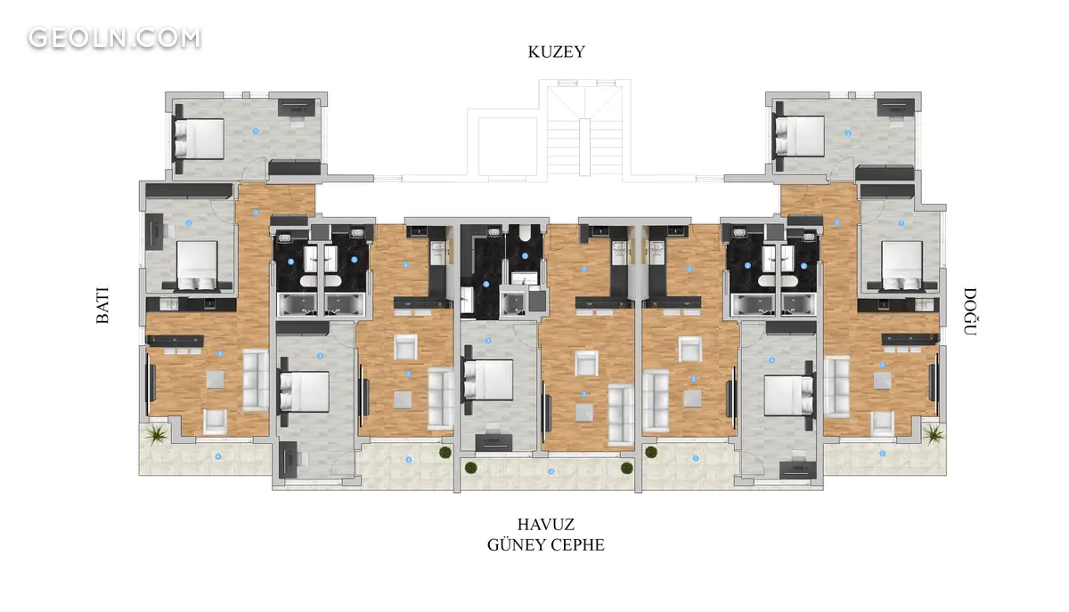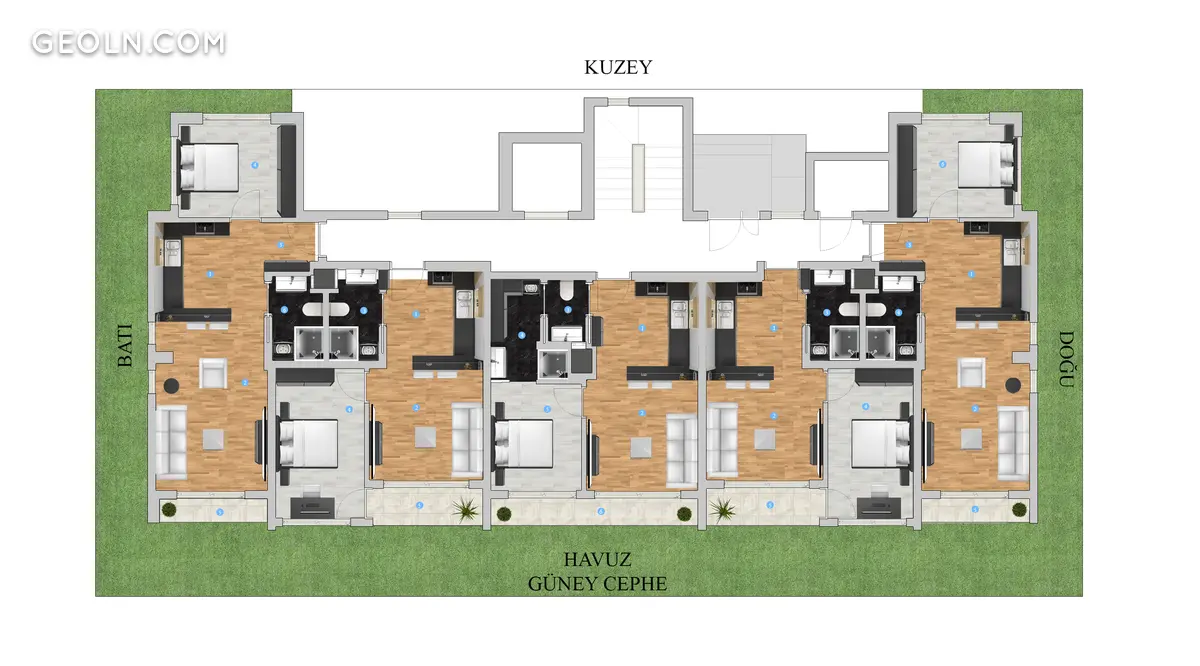- 所有公寓都朝南,可以看到游泳池(大海2楼后可见)