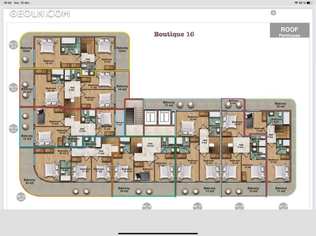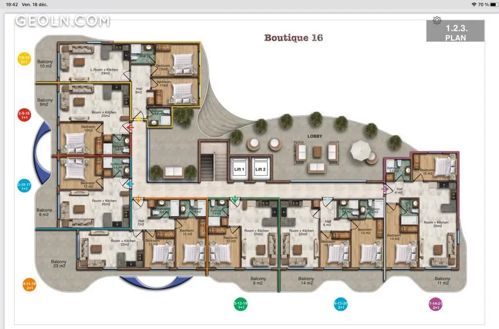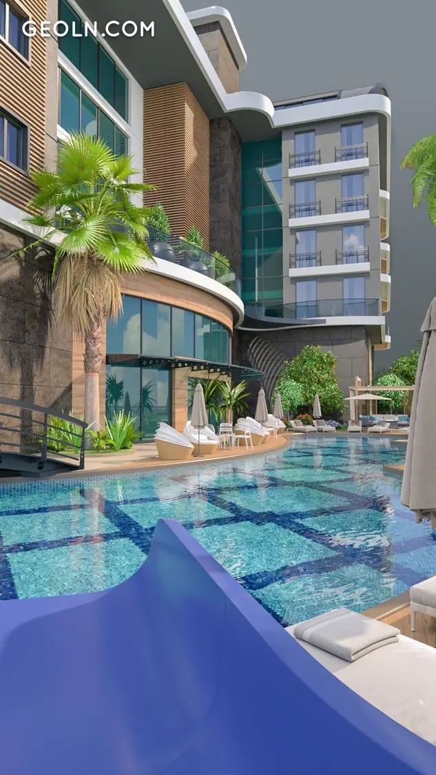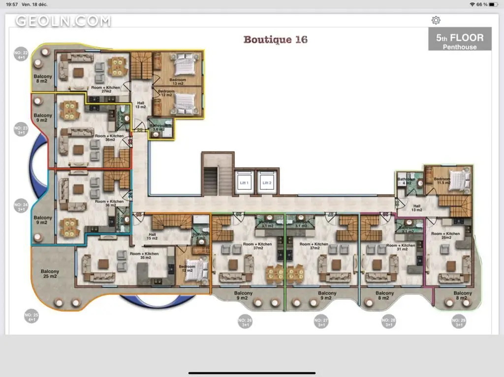 该综合体有四种类型的公寓出售:(1+1、2+1、顶层公寓 3+1 和 4+1)。公寓面积为40至70平方米。