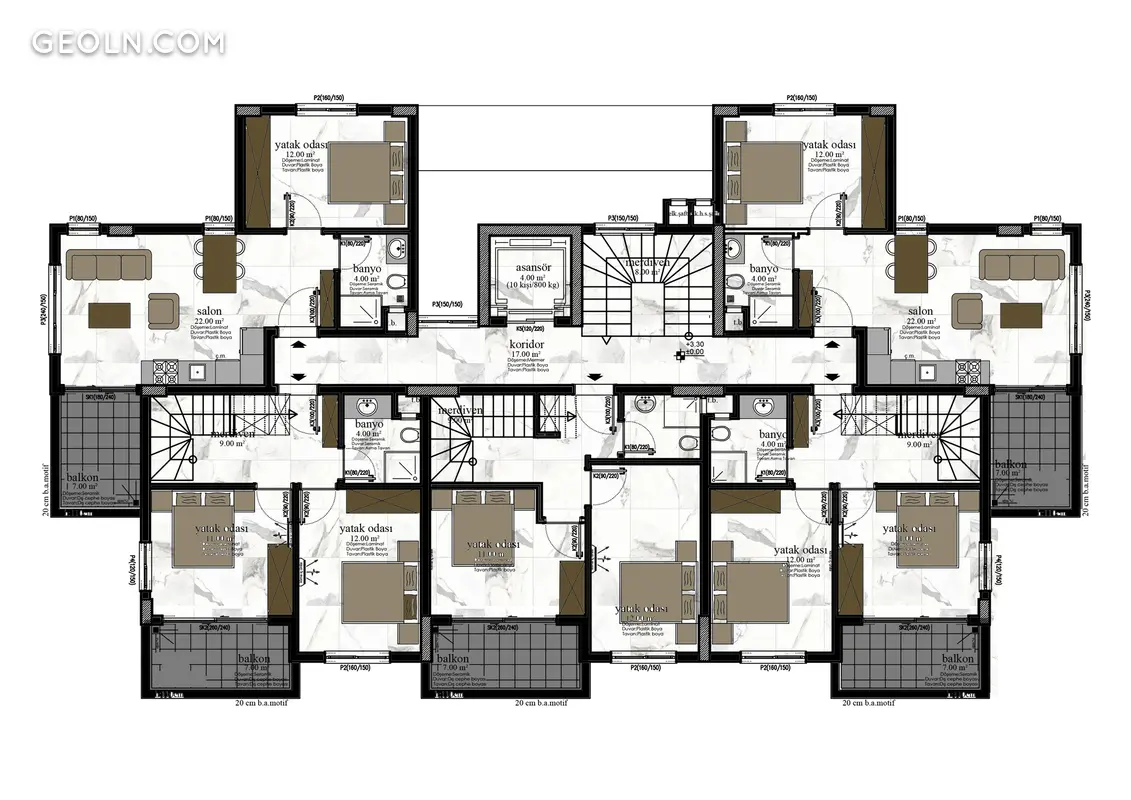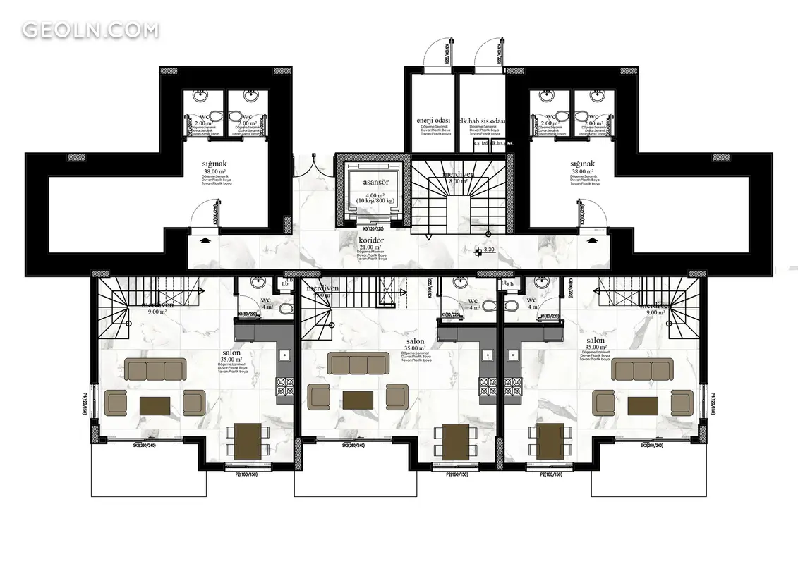 - 3 间 120 平方米的 2+1 公寓,位于一楼“花园复式”,带 1 个阳台、1 个大型花园露台、 2 间浴室和一个卫生间。公寓 2,3,4 有一个 35 平方米的私人庭院。