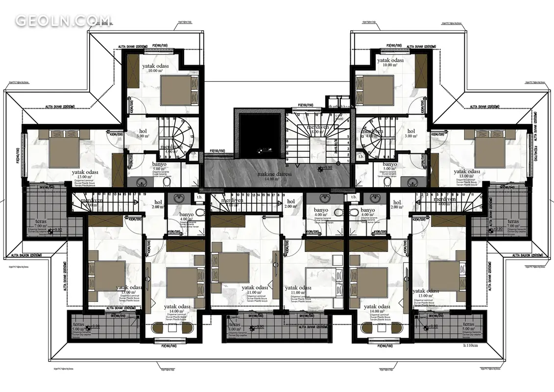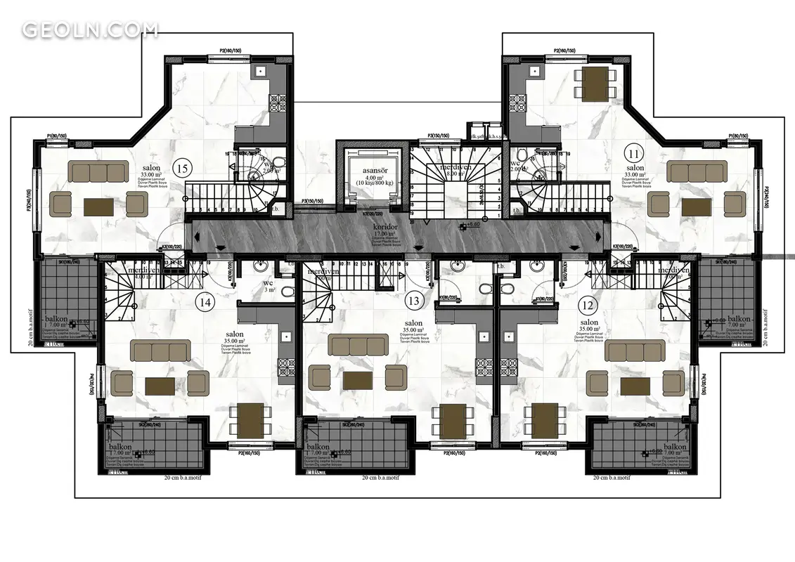 - 四楼 5 套 120 平方米的复式 2+1 顶层公寓,带 2 个阳台、2 间浴室和一个卫生间 *1+1公寓的价格包括炉灶、烤箱和油烟机。