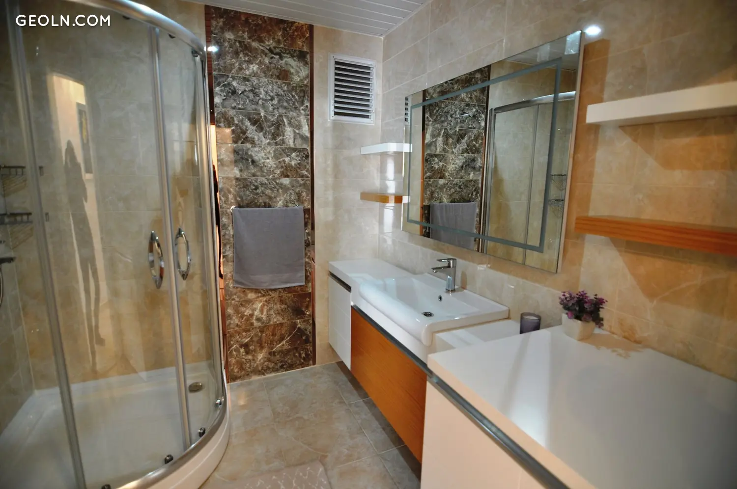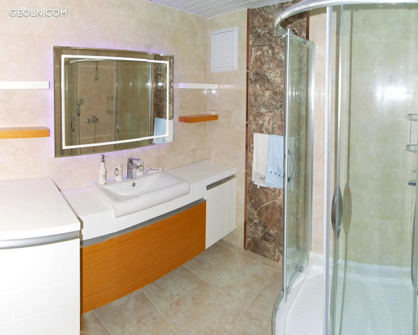 - 浴室配有时尚的固定装置、原装内置家具和镜子