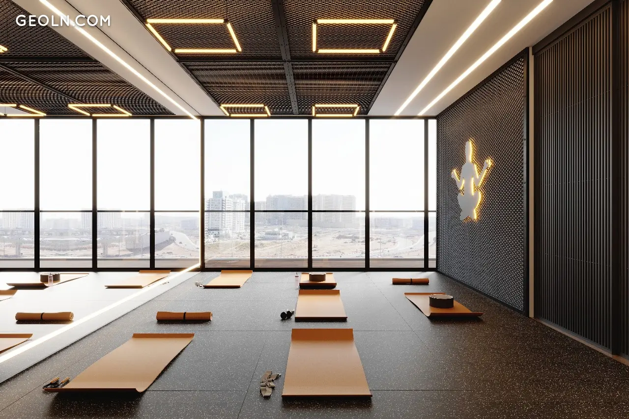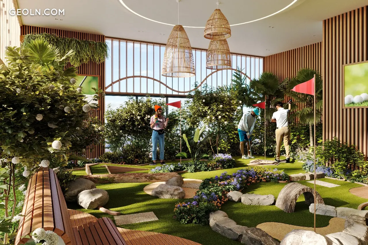 Удобства: большой бассейн для взрослых и детский бассейн на крыше подиума, тренажерный зал, спа-центр и сауна, детские игровые площадки внутри подиума и снаружи, зона для занятий йогой, зона для барбекю и пикников, кинотеатр, площадка для мини-гольфа.