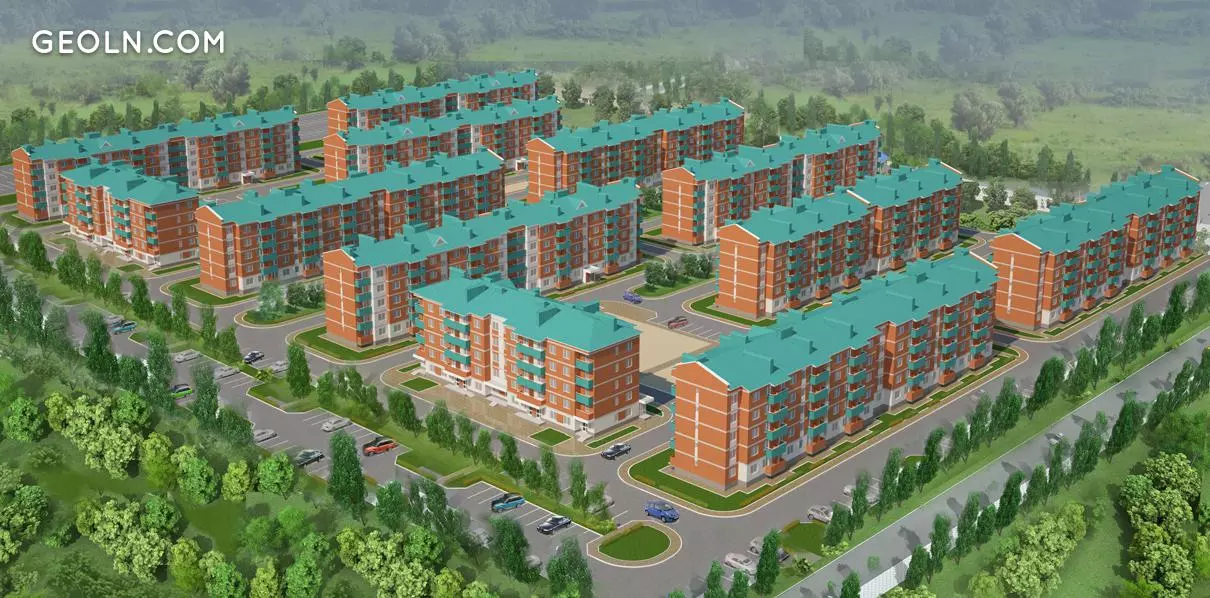 该综合体是五层整体砖混结构住宅的开发,带有经济舱公寓。总共65座建筑物应以相同的建筑风格建造。第一阶段的建设始于2013年11月,2014年10月开始动工建设四栋房屋。目前,已经建立了12座建筑物。